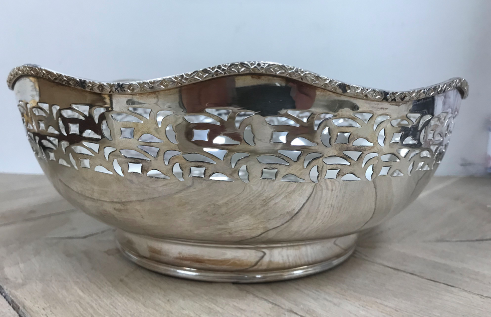ITEM 14 SOLD One left of this beautiful pierced medium silver serving basket/bowl. I own a few of these and they make the perfect bread baskets! Measures 12.5″ round $45.00 could use a nice polish:)