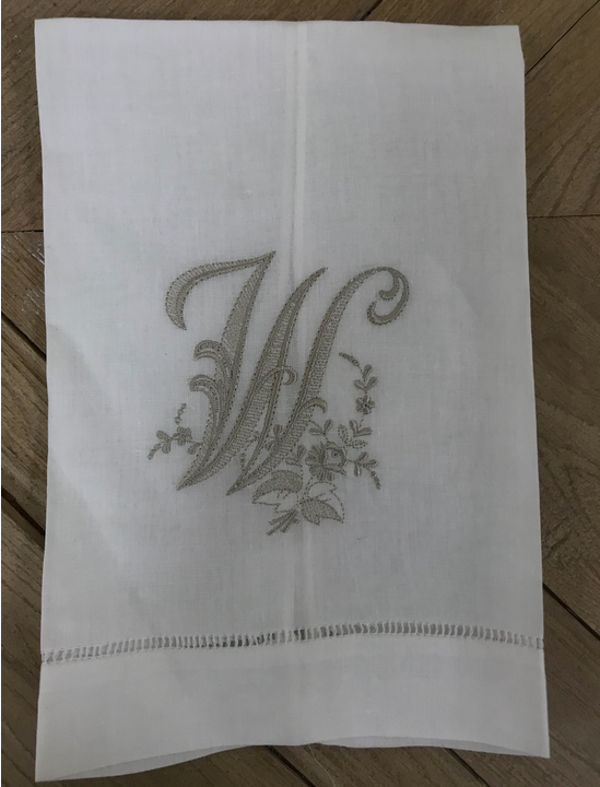 ITEM 19B One W linen guest towel with ecru lettering $8.00