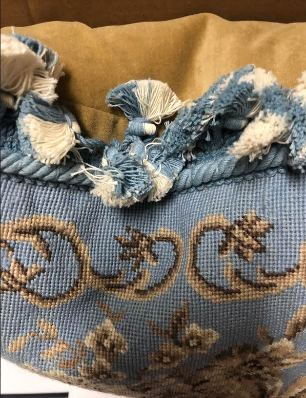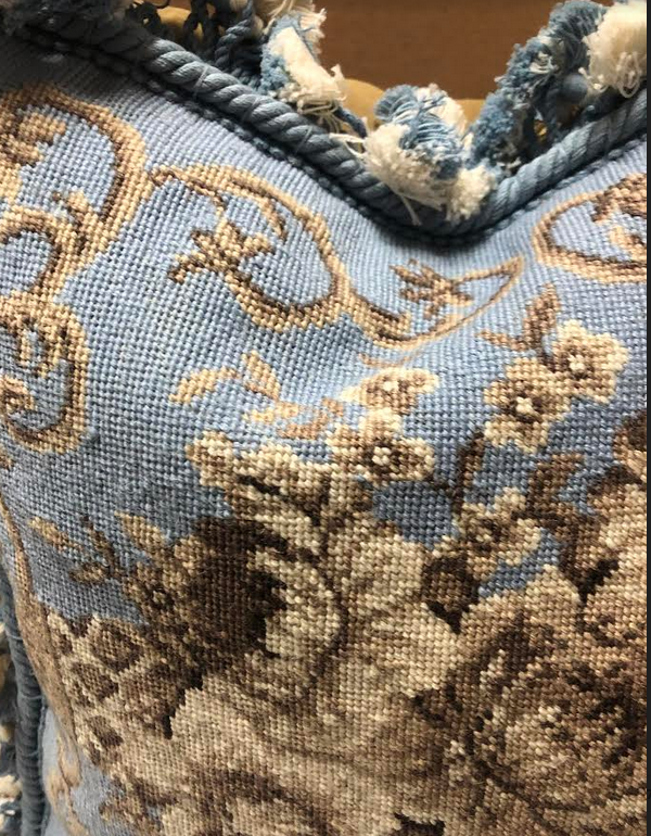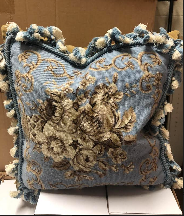 ITEM 10 SOLD Have a pair of these beautiful blue/gold very fine needlepoint pillows backed in a soft velvet and trimmed in a beautiful blue/white tassel trim. These also include the plump down inserts. Measures 18″ x 18″