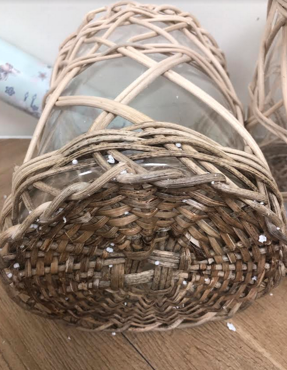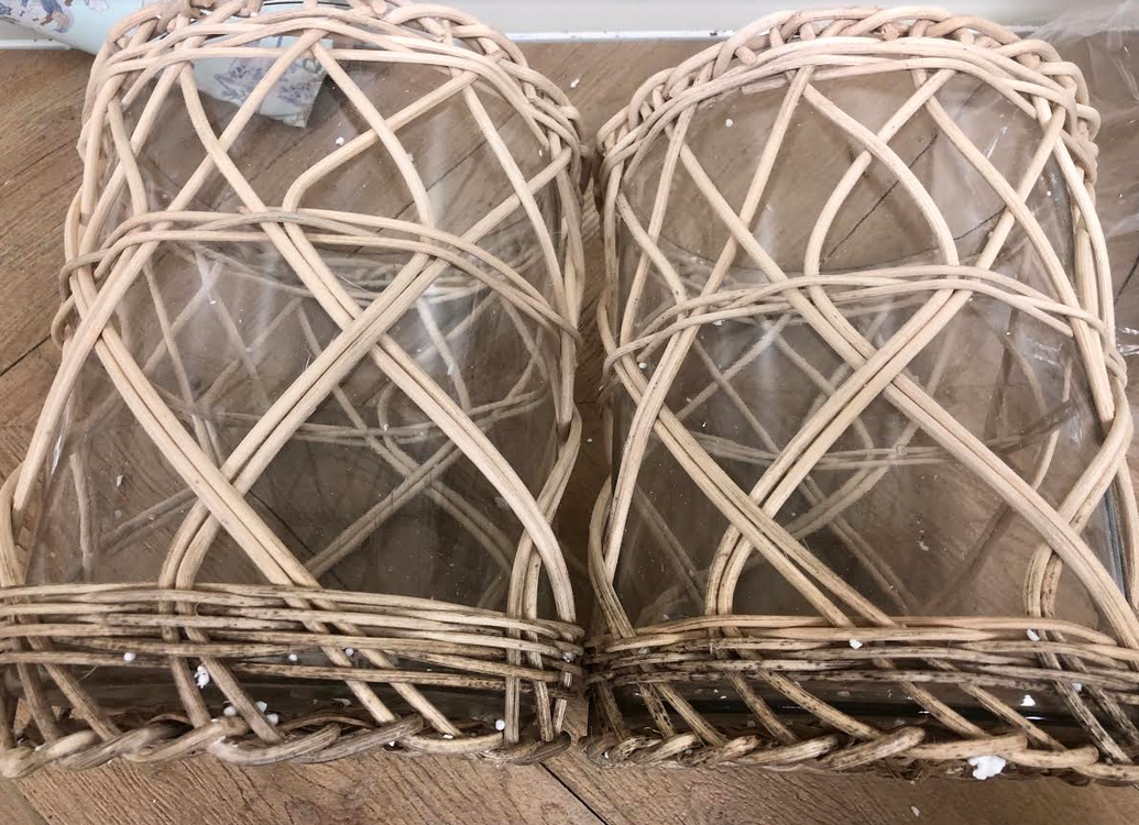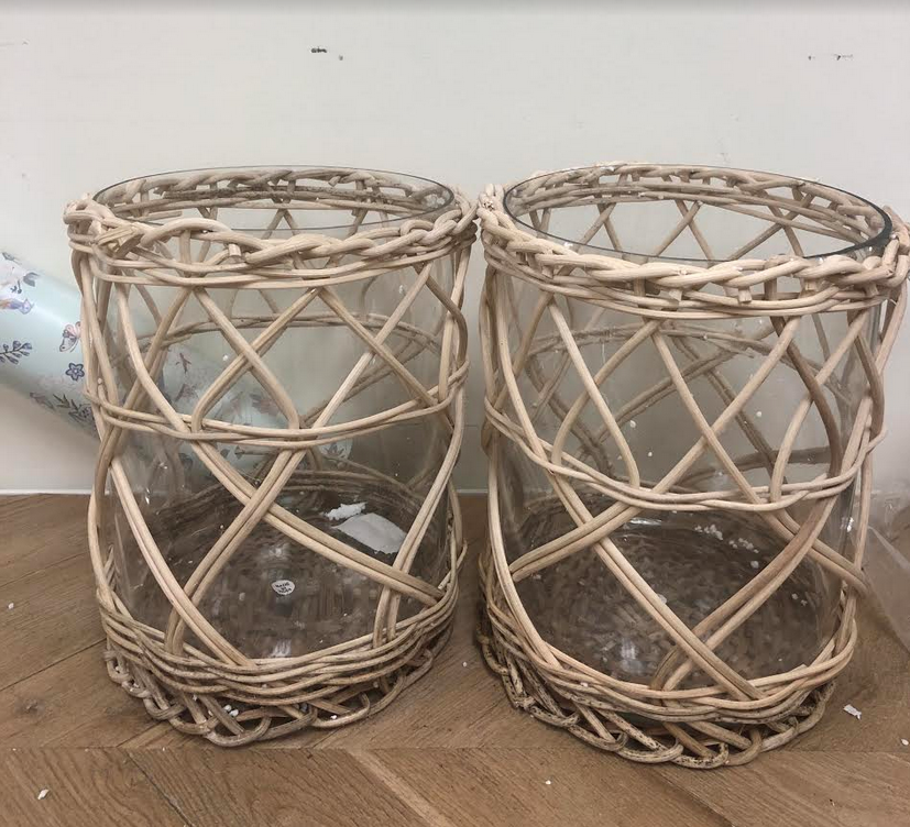 ITEM 20 SOLD When we first got our beautiful wicker oversized chunky hurricanes, some arrived “dirty”. It is not real dirt of course but in transit they got soiled, some very slightly but I did not want to sell them this way. So…offering these “second quality” medium and large hurricanes at a sensational price. They double. as fabulous vessels for cut flowers, and work beautifully with pillar candles inside them