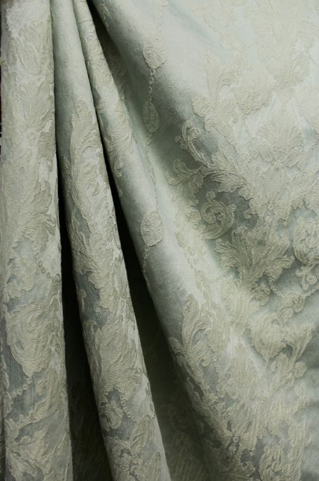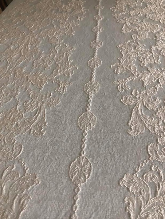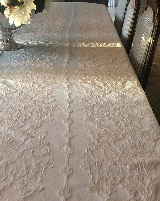 This set includes a tablecloth in a pale blue/green damask like washable fabric that looks like old fashioned embroidered linen, truly fabulous!