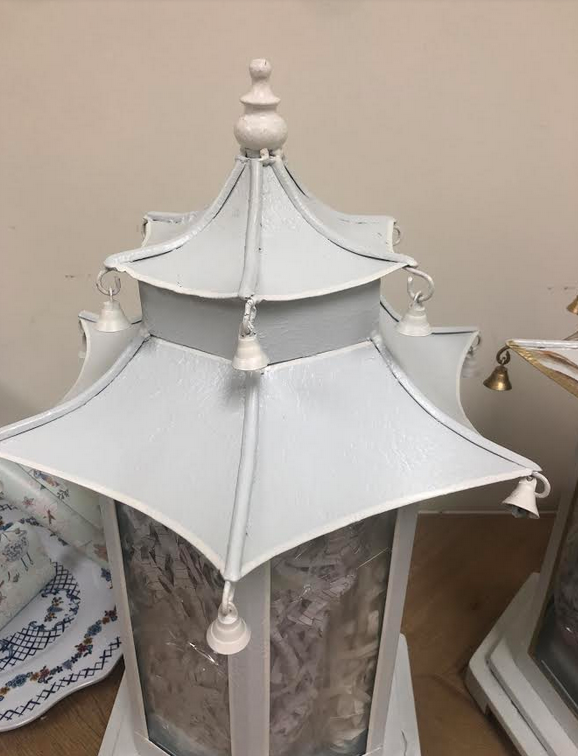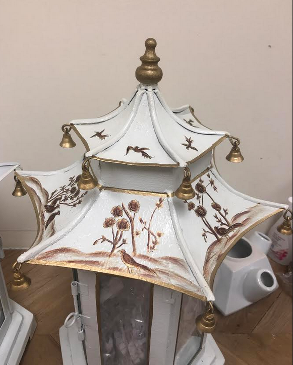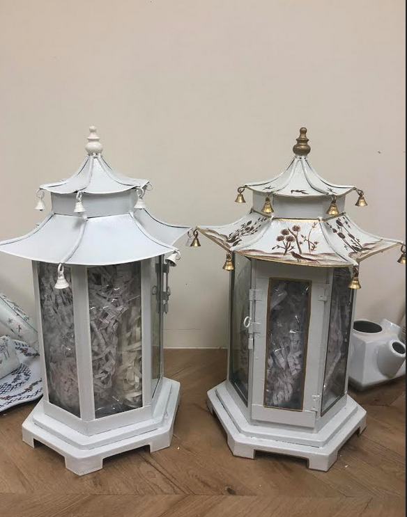 ITEM 1 Have 2 or 3 left of these lost and found magnificent tall pagodas. These chinoiserie tole pagodas are spectacular! Offered in two colorways- pale blue with gold chinoiserie and pale gold with white.