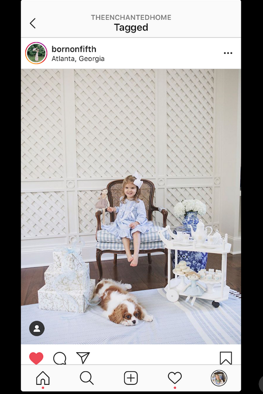 The sweet little girl in the grow-up chair, with her King Charles spaniel at her feet, and a tea cart loaded for a dolly’s tea party, swept my heart away!