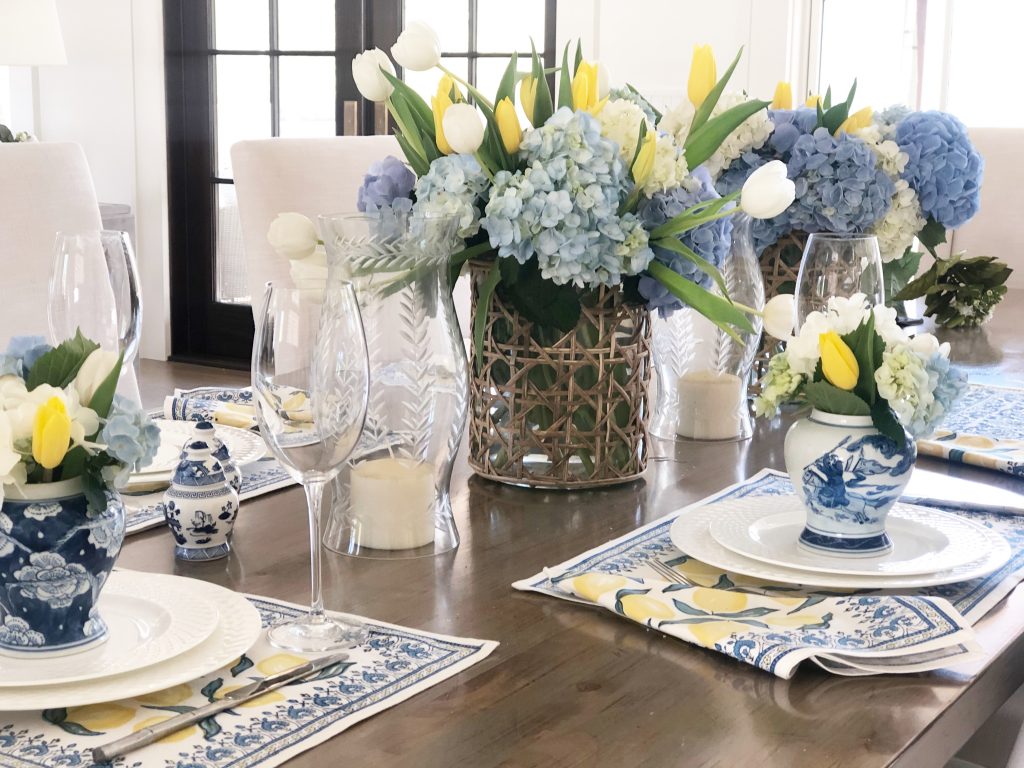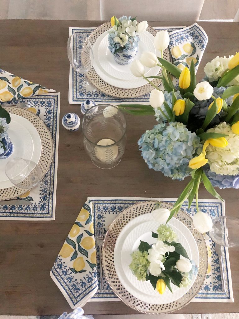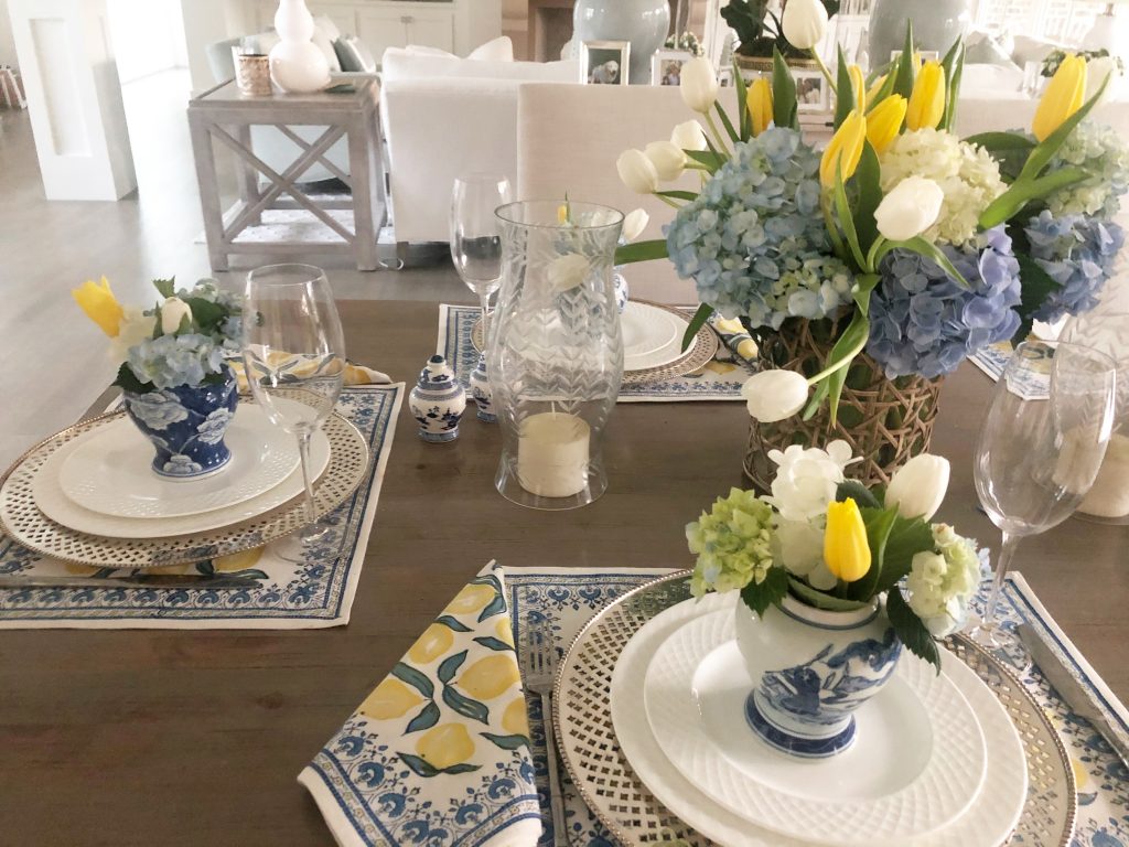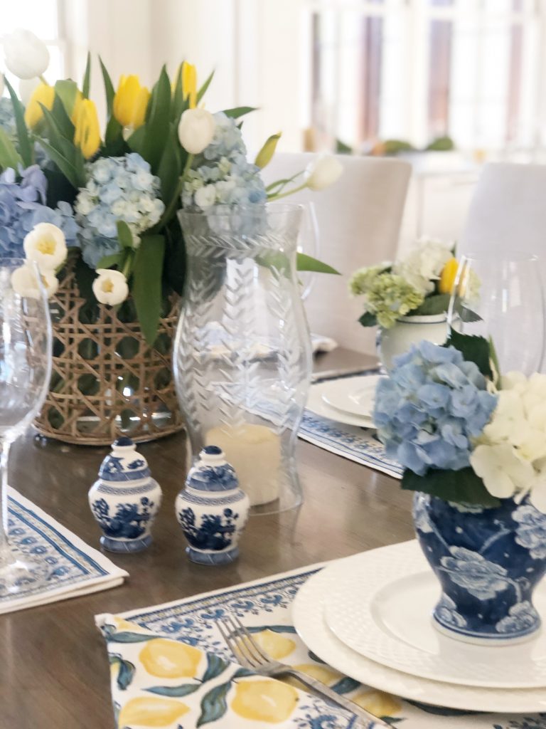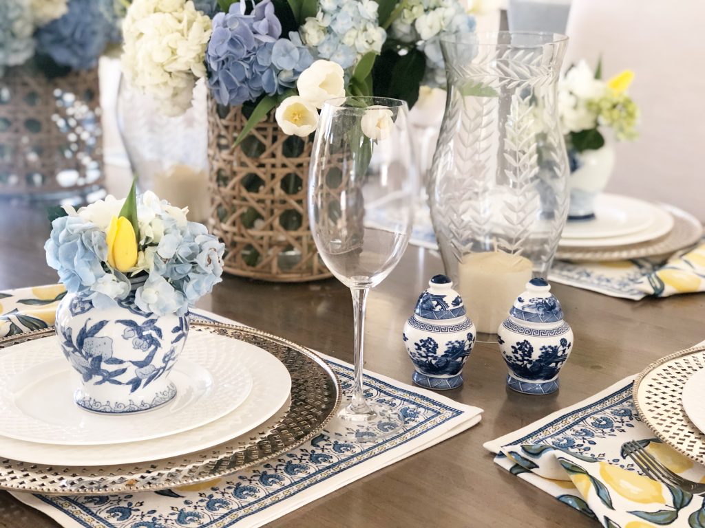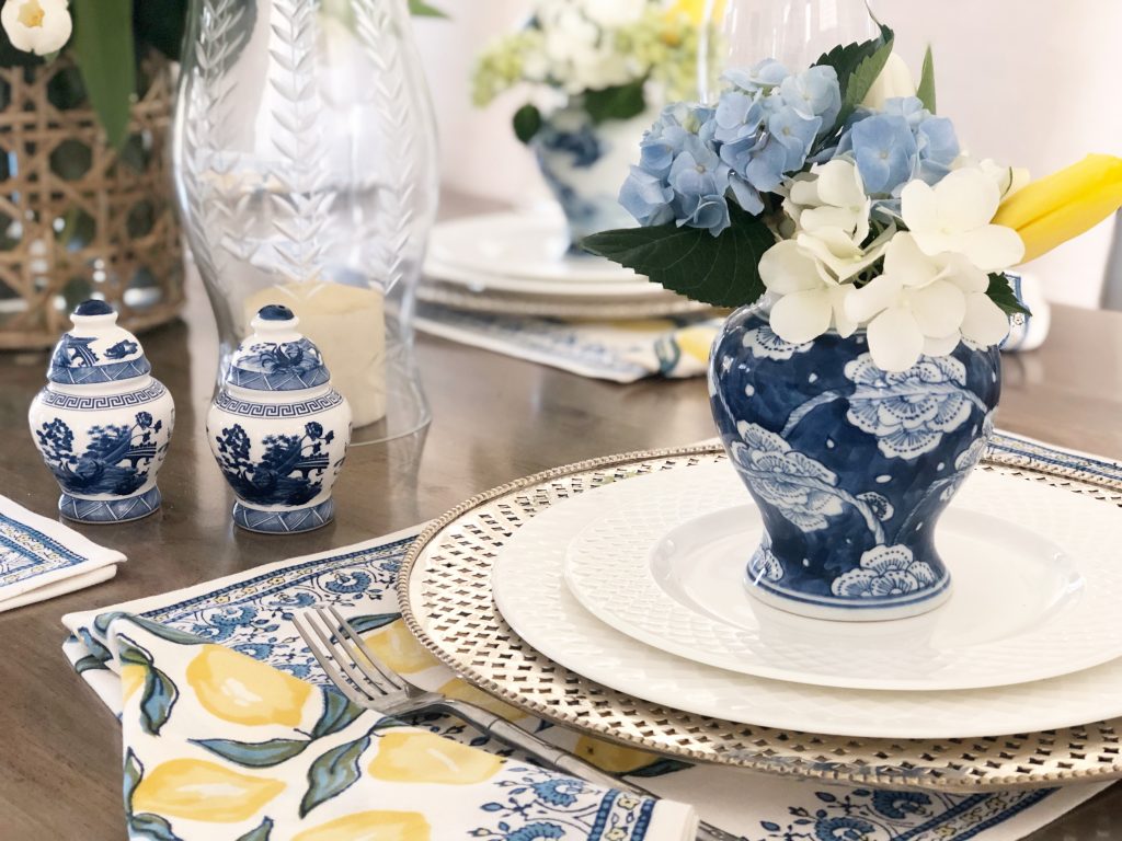 That table setting is really pretty – beautiful flowers! I have those little ginger jar salt & pepper shakers and absolutely love them!