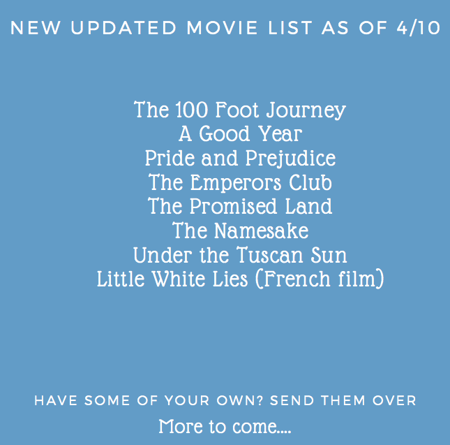 A Good Year and Pride and Prejudice are two of my most faves that I have probably seen at least 20 times, never gets old! Plus I love the soundtracks. On top of that, watched a few others that I forgot are so good (below). A Hundred Foot Journey was a feast for my eyes. So here is a new list of some you may not have seen, thought it was worth passing along….