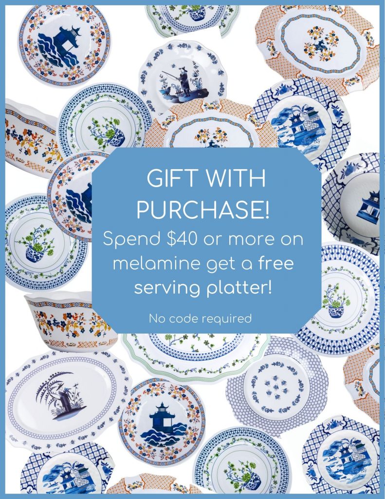 And an unannounced giveaway. With any purchase of $40 or more of melamine, you will receive a free serving platter! Click here to see our entire melamine collection.