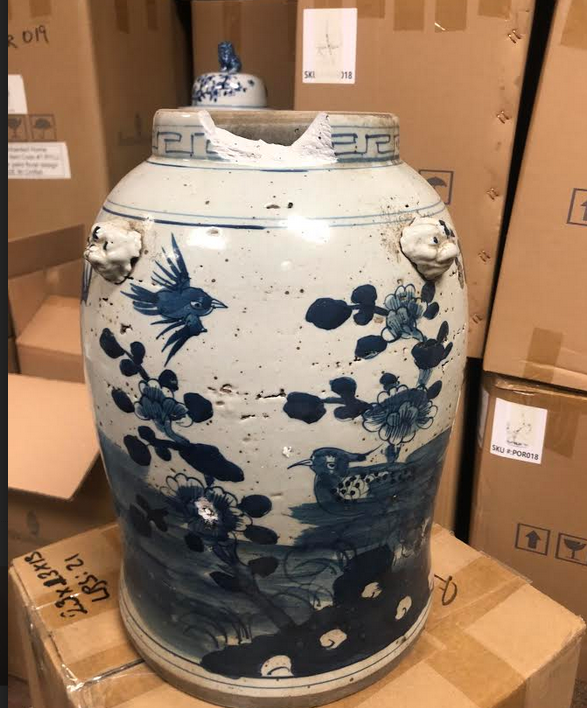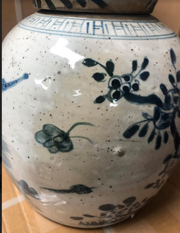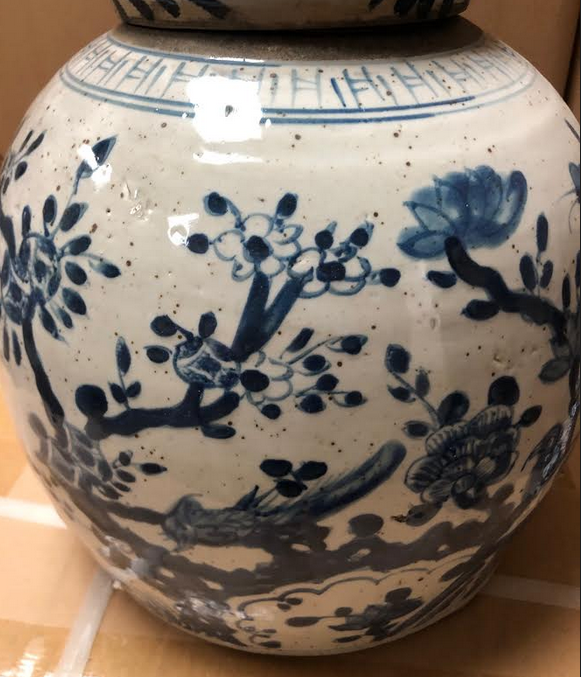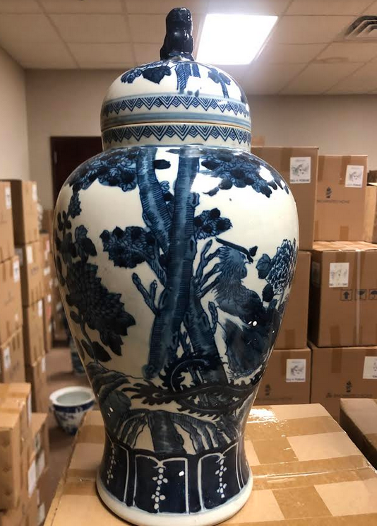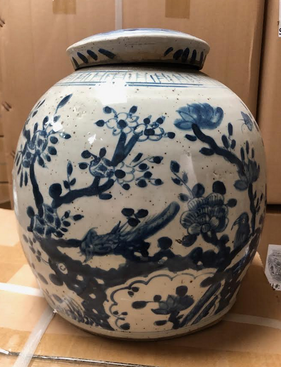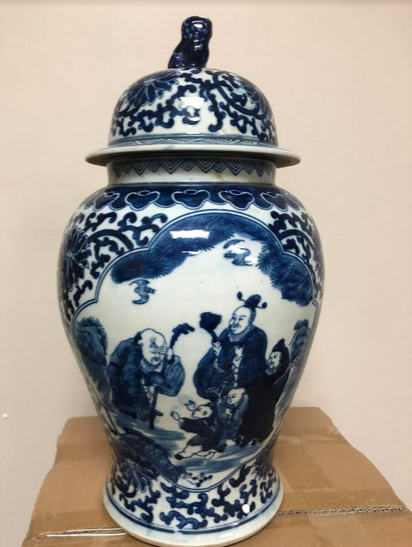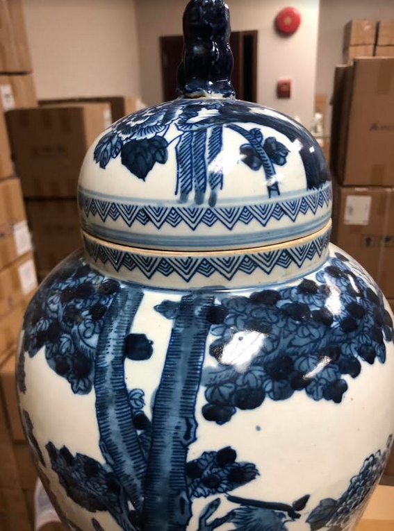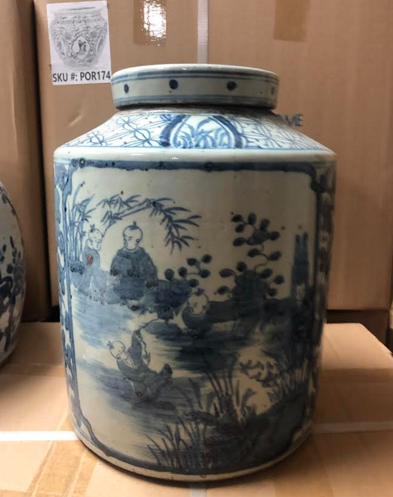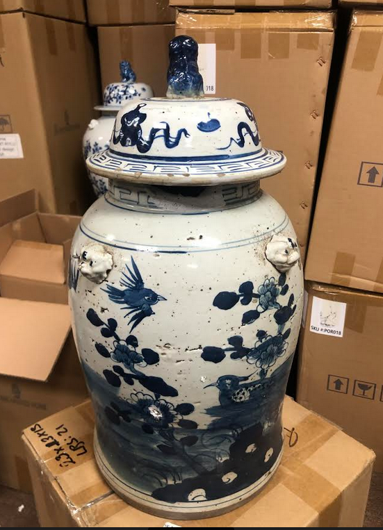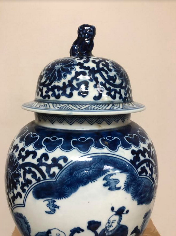 ITEM 2F Last of this beautiful mid sized ginger jar, a real beauty with foo dog lid. Love the rich navy and beautiful intricate scene.