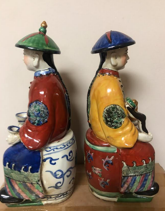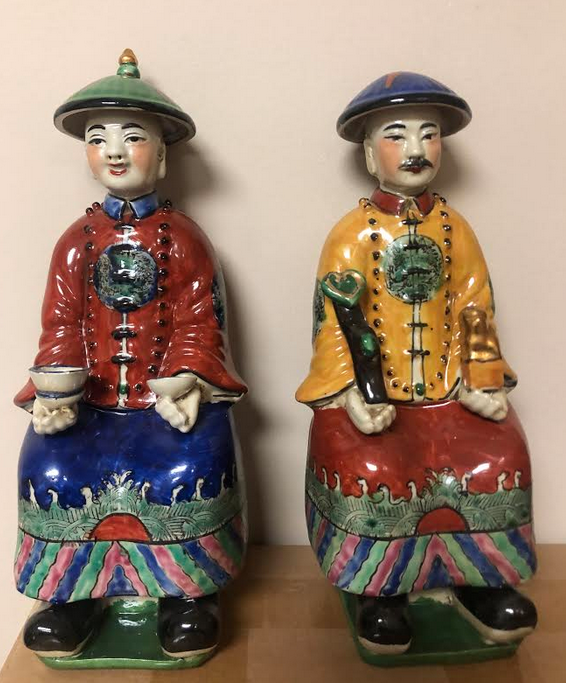 ITEM 2D These beautiful colored emperors normally come as a set of 3 but one broke so offering these up as a pair, so charming. Love how they sit on the garden set. Can be used as a pair or separately , and would make a snazzy pair of bookends!