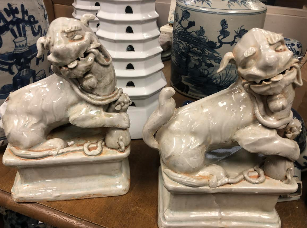 ITEM 2H We have 2 of antiqued white foo dogs, both same direction. These make a great finishing detail for an existing vignette and always look great atop a stack of coffee table books.