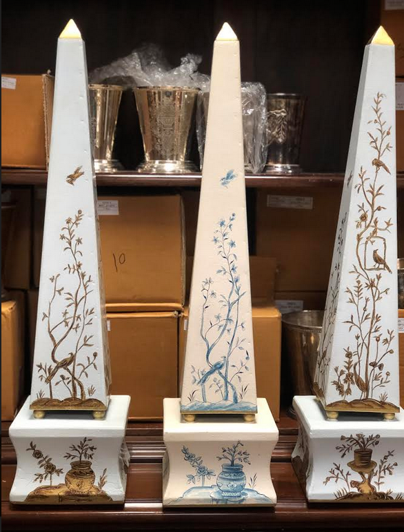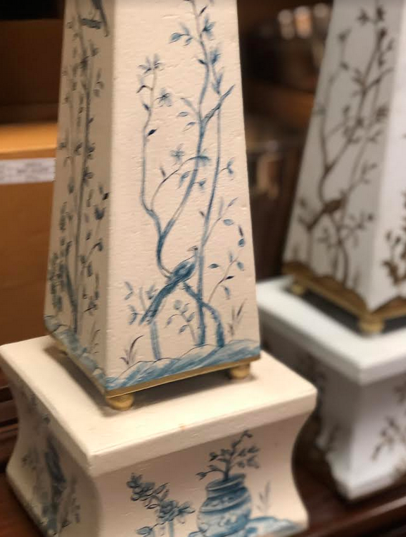 ITEM 10 Last pair of these beautiful pale blue/gold obelisks. These are a stunning and regal, last three. Very impressive and a great way to finish a vignette you may have been struggling to finish.