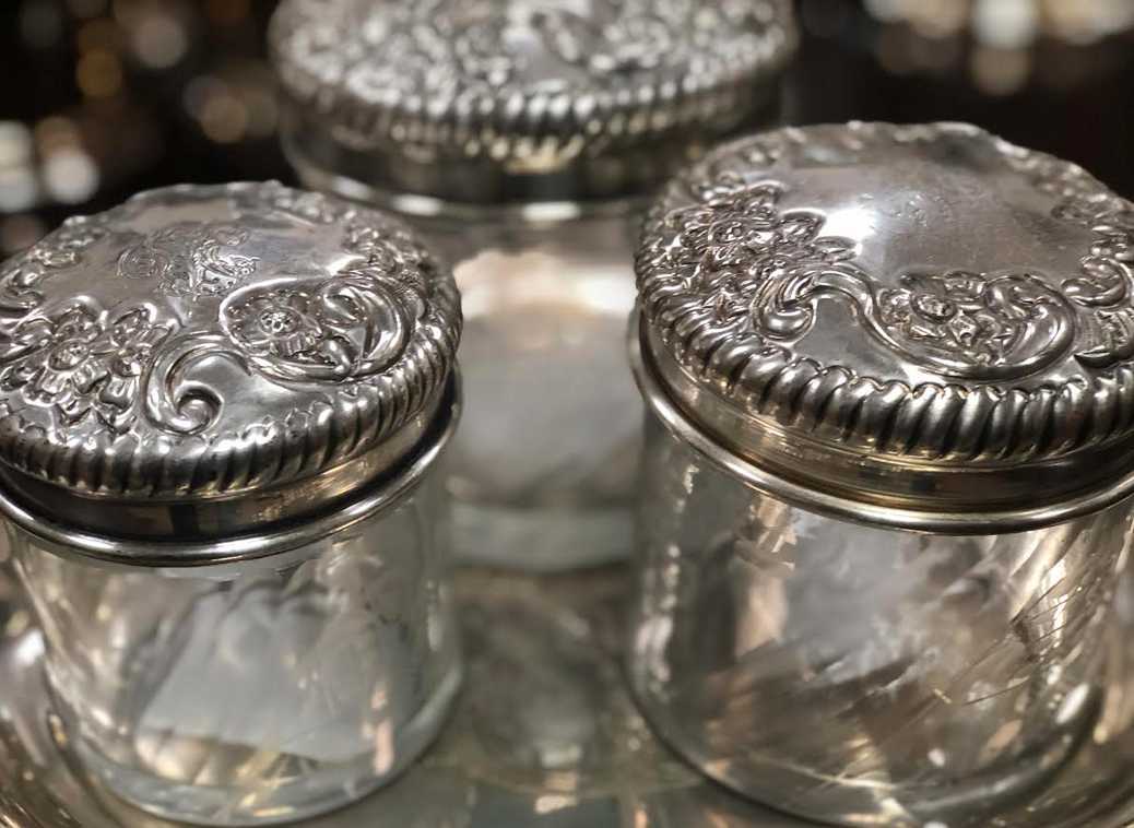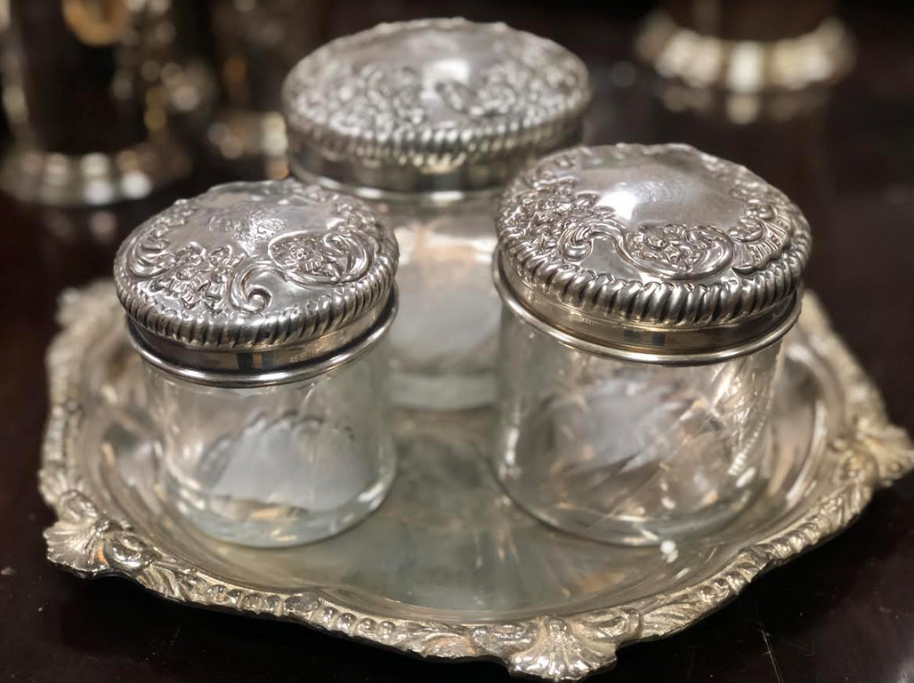 ITEM 7B This group includes a beautiful embossed tray (12″) with our three piece vanity set$85.00