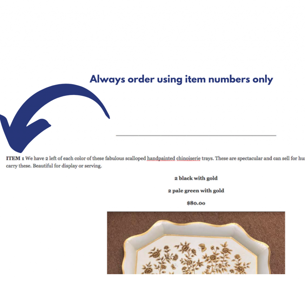 Please be sure you include item number NOT item descriptions (unless specifying a color or style)