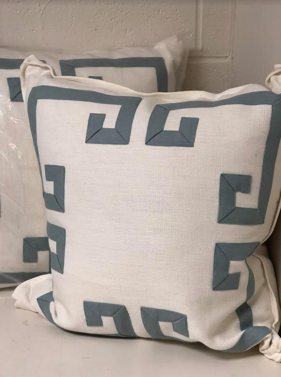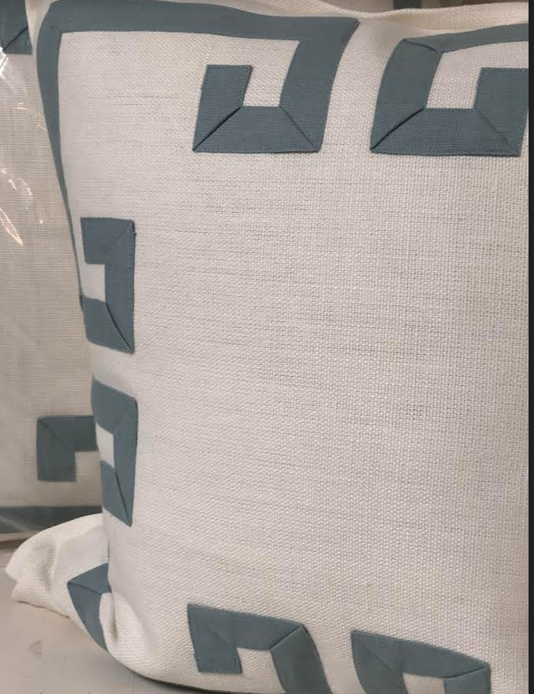 ITEM 19 Have one pair of these incredible fretwork linen/cotton custom throw pillows with plump down insert. These are FABULOUS. I owne them for my PB house and they are a favorite. Ivory with a pale blue/gray fretwork pattern.