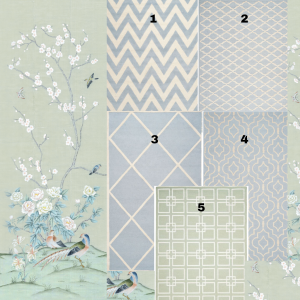 Number 3 is my first choice & my second choice as well. It compliments the serene mural perfectly & will definitely pull out the blue in the mural . Reply