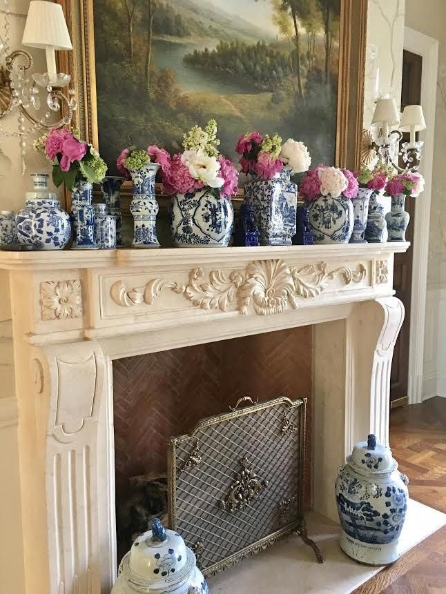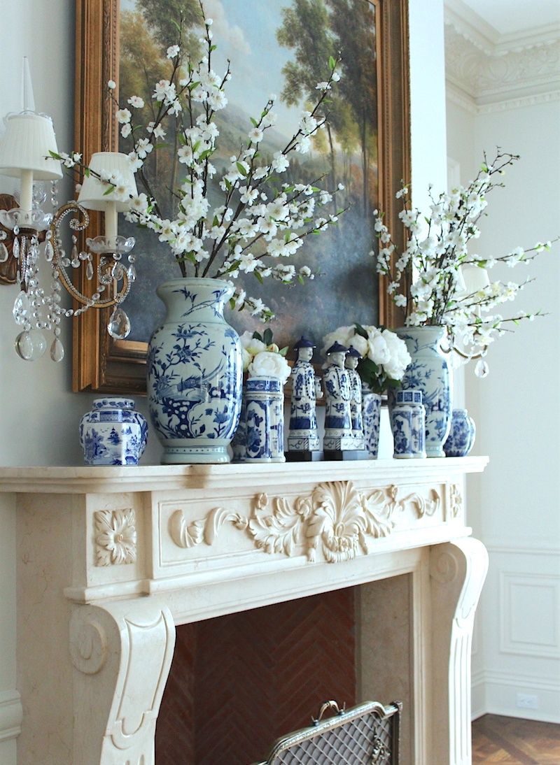 To me, a mantle is perhaps one of the easiest places to use a blue and white vignette and create serious impact. You can change things out to your hearts content or keep things there and just change out flowers for the season.