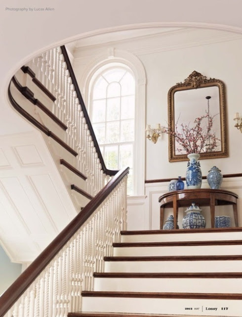 Have always loved the look of a small table with a blue and white vignette on a stair landing, so beautiful! Lonny