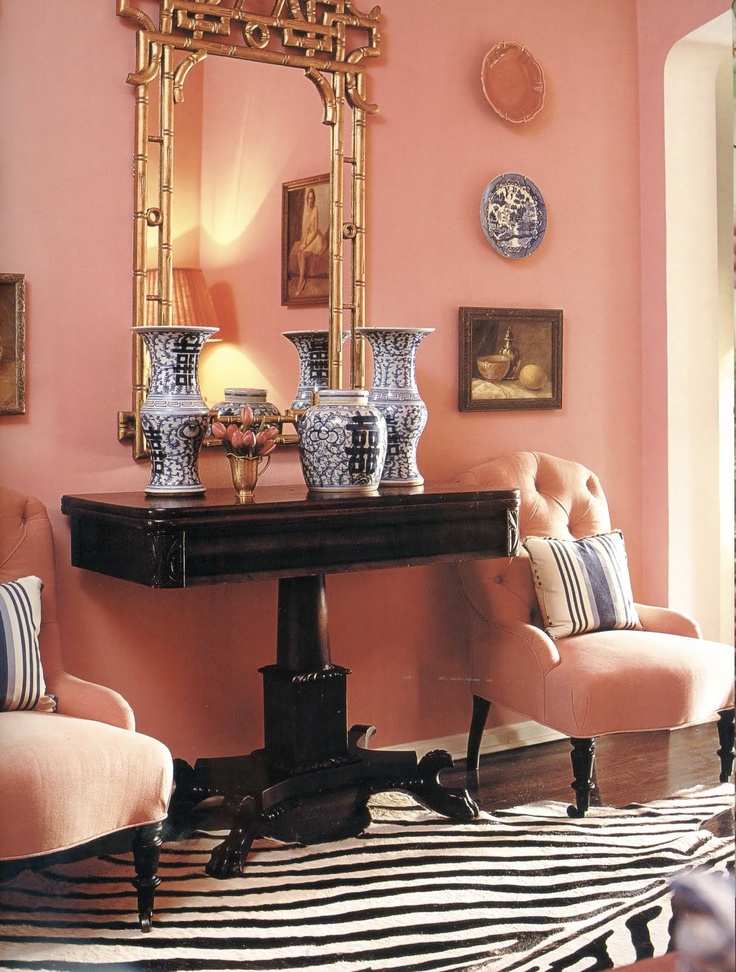 Love the idea of the blue and white against these dreamy pink walls, Mary McDonald