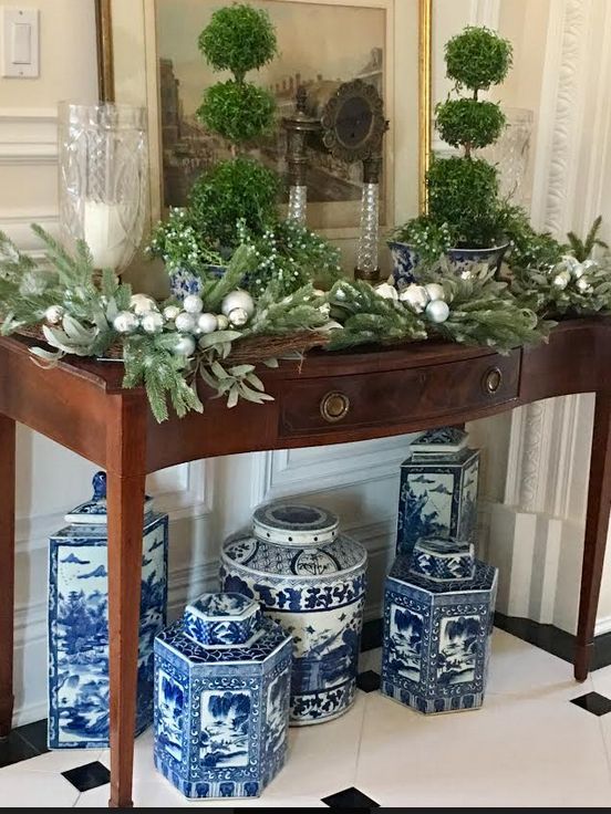 I incorporate all my blue and white vignettes into the holidays, they look gorgeous next to mixed greens!