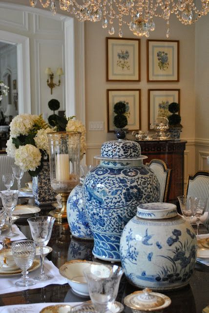 My dining room table which is always a prefect place to show my love for blue and white, love clusters of jars in the middle (the bigger ones are taken away when we sit down to eat for those wondering)