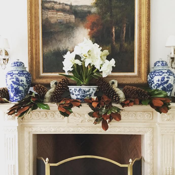 Don’t forget about blue and white during the fall, it looks fabulous with pinecones and fresh magnolia! (my mantle)