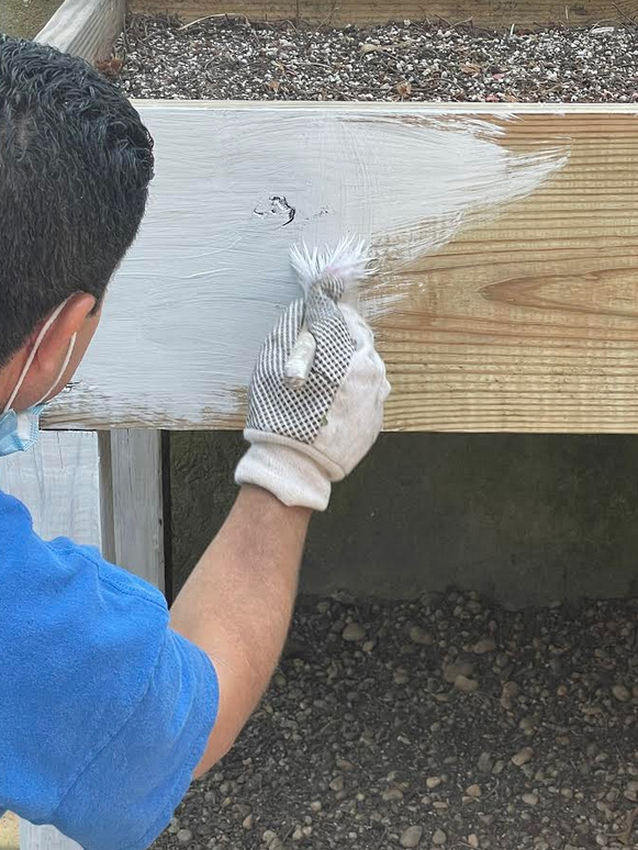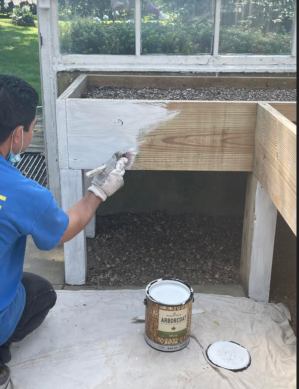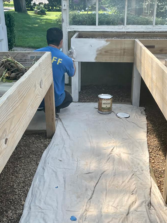 And get started using Arborcoat from Benjamin Moore (a stain that goes on like a not quite fully opaque paint) yet absorbs into the wood, just what the doctor ordered!