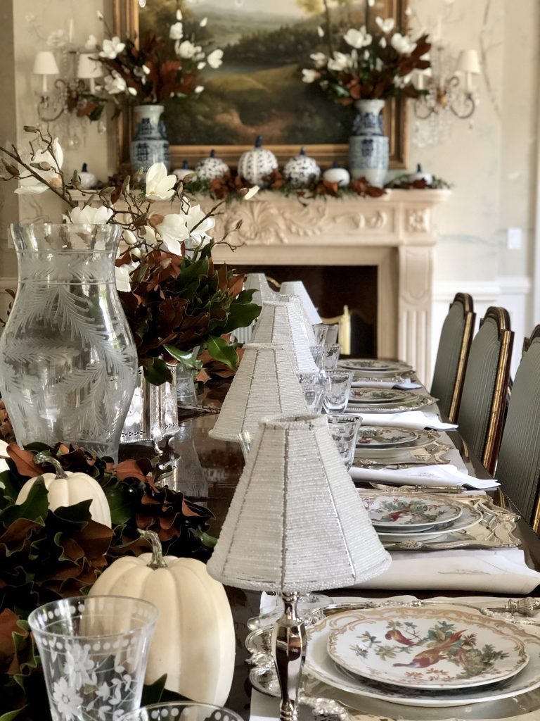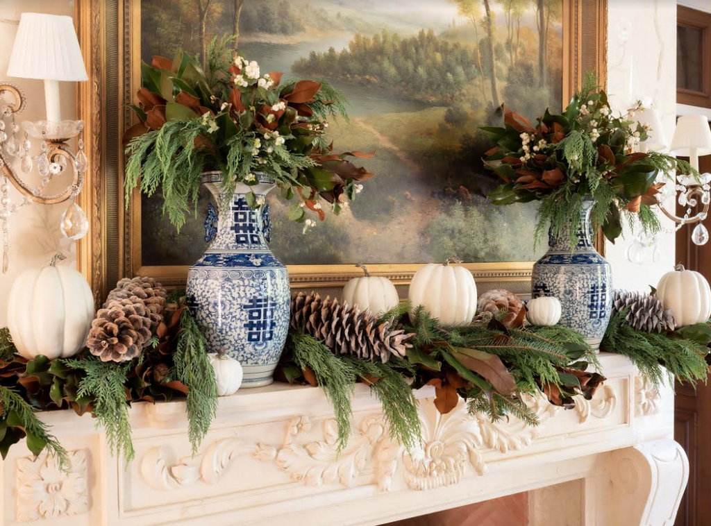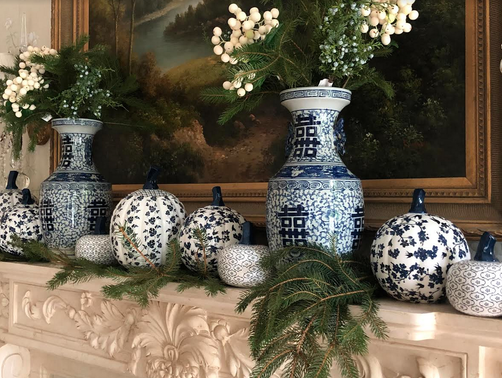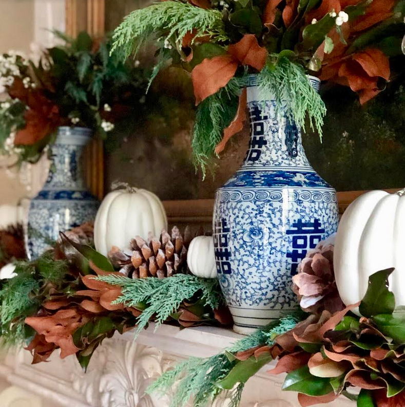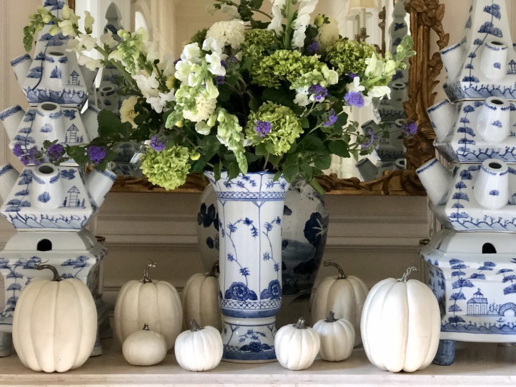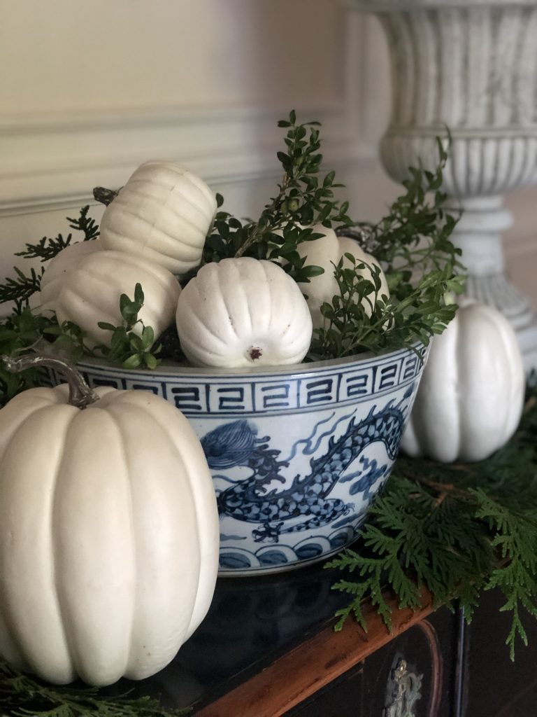 Blue and white works beautifully for the fall mixed in with the darker greens and earth tones. Let me show you what I mean…..