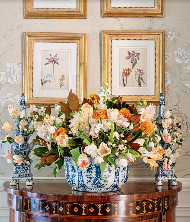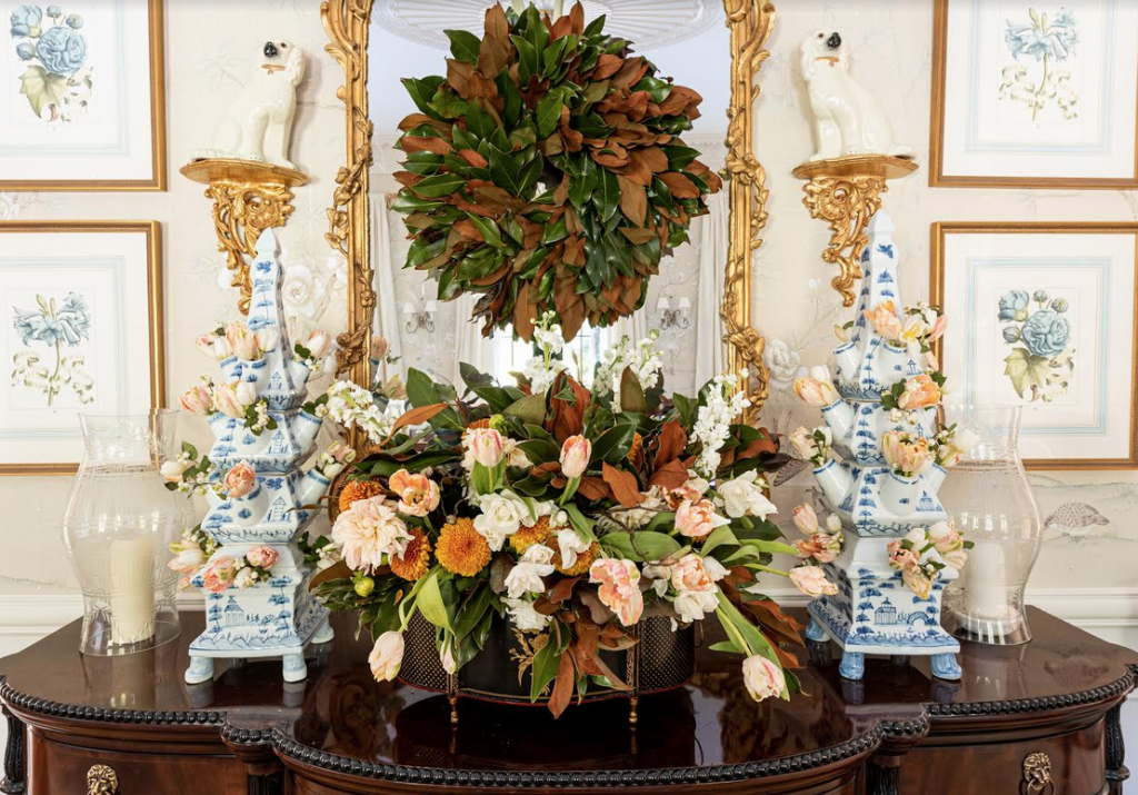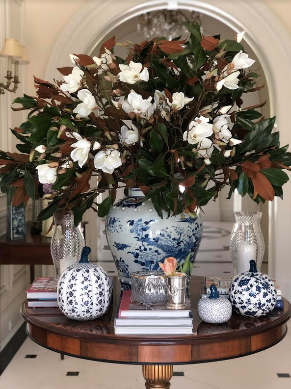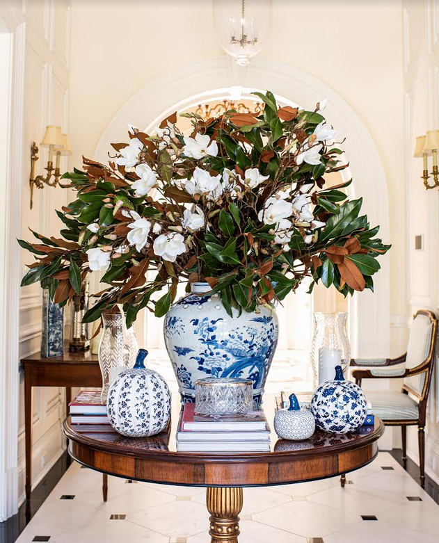 Nothing says welcome like a big spray of fresh magnolia mixed in with our own magnolia flowers in my favorite giant raised dot jar. I did on a foyer table and it just sets the tone for fall:) This method can be used for any sized ginger jar
