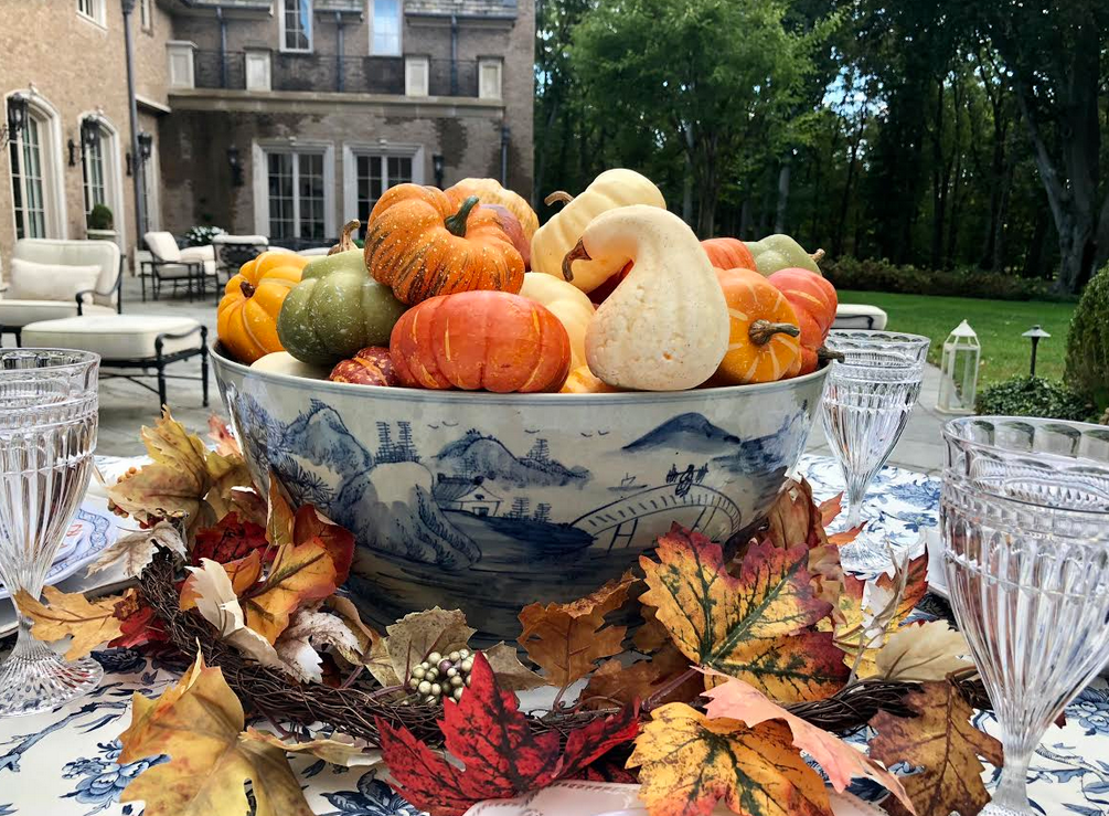 This fabulous large bowl is coming back in about 5 weeks, love it filled with pumpkins and gourds on a blue and white table