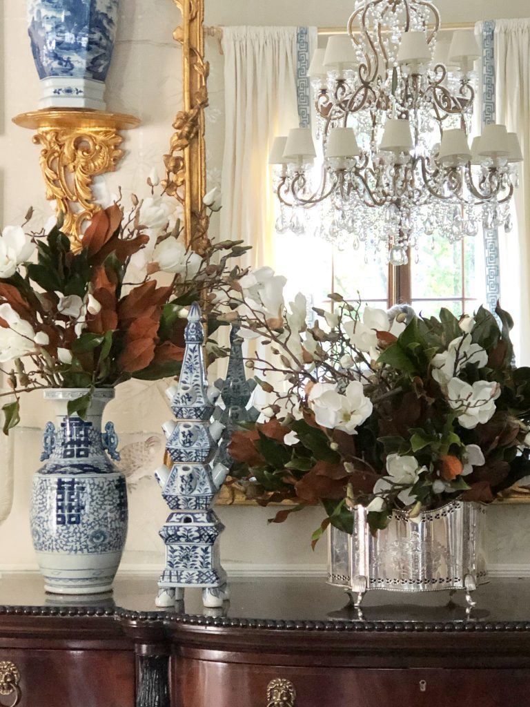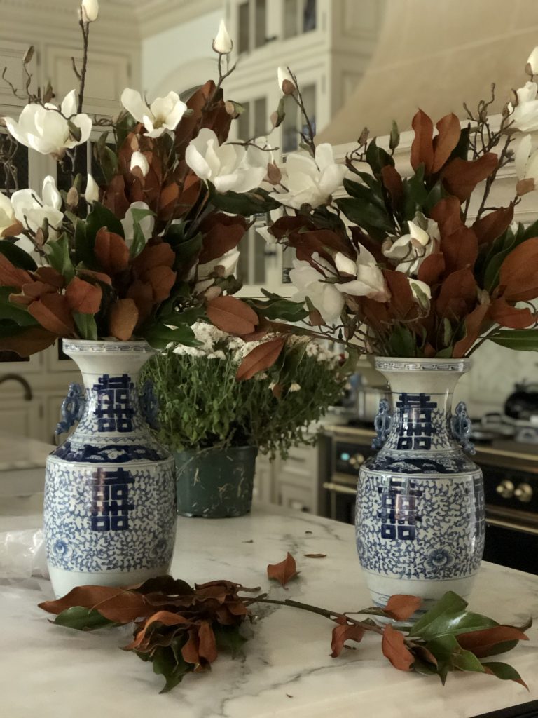 Glorious silver and blue and white, a match made in fall heaven! Filled them with more magnolia and some of our magnolia blooms