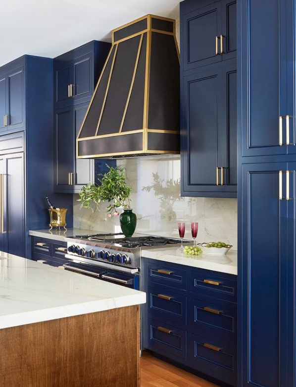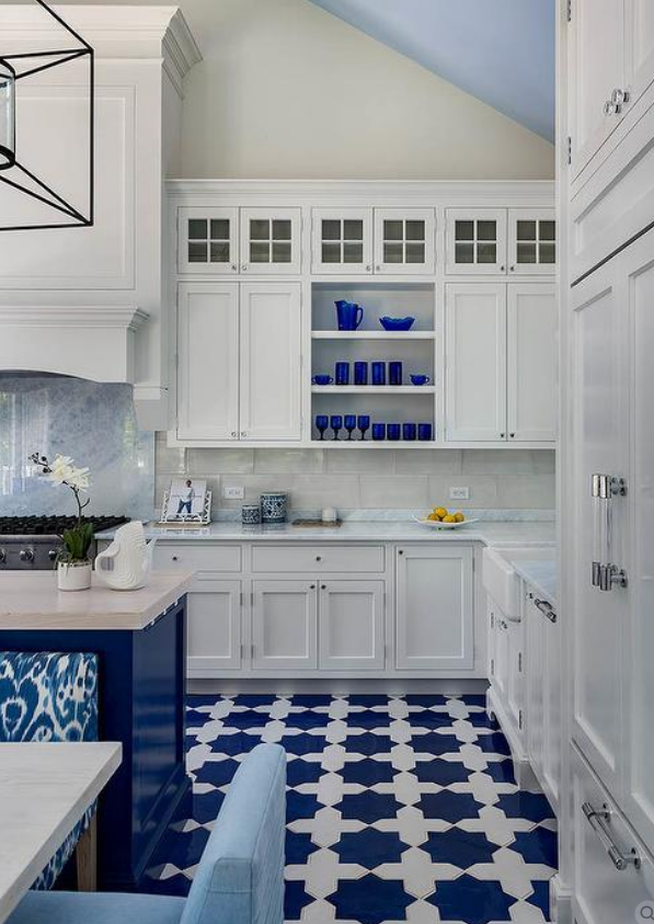 The bold floor in the kitchen would drive me insane. I could see it in a small bathroom, perhaps. The huge island in first picture looks good but that kitchen would not work for me- the island would stay “messy” as it is the only area large enough to do any prep work and the sink is there too ! My favorite is the last photo- Mallory Mathison’s glorious white kitchen with beautiful glass cabinet doors and, my favorite, blue & white accents ! Swoon ! The literally “all blue” kitchen is too much of a good thing- needs WHITE ! The white cabinets with dark wood hood is missing the mark, somehow. The black cabinets works because of the abundance of white, but not my favorite. I could go on but think I’ve said enough ! Haha ! Enjoyed this post & im anxiously awaiting my new order from The Enchanted Home ! ❤️
