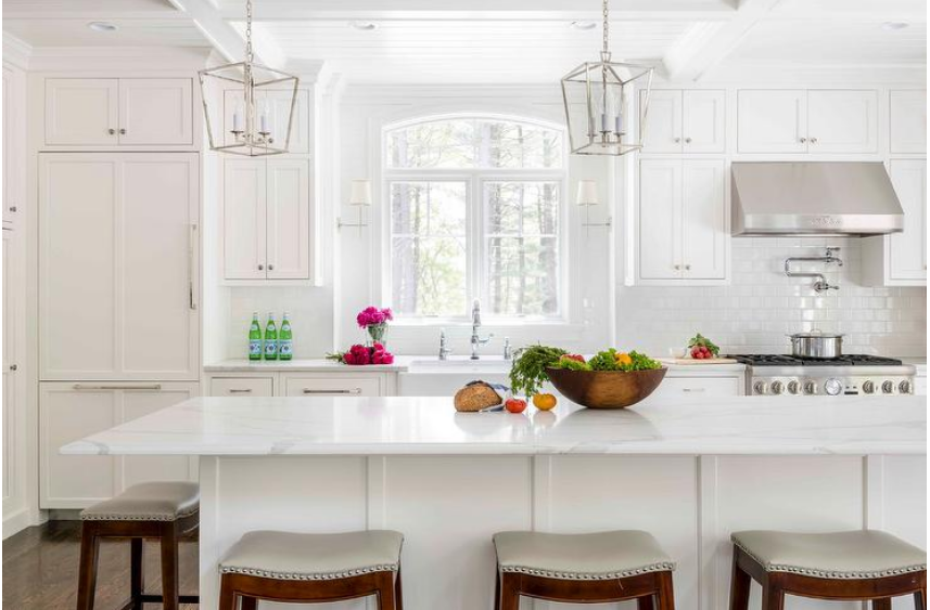 Love the last white kitchen. I personally love gold handles and sconces with all white. It warms the white. Nickel is shiny and pretty but always looks so cold and austere.
