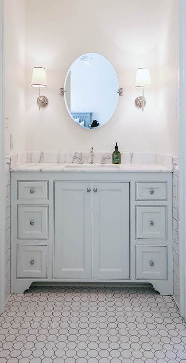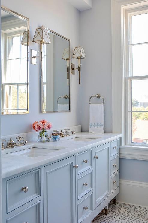 Love the look of this very soft powder blue vanities, so fresh feeling and definitely gives off coastal vibes