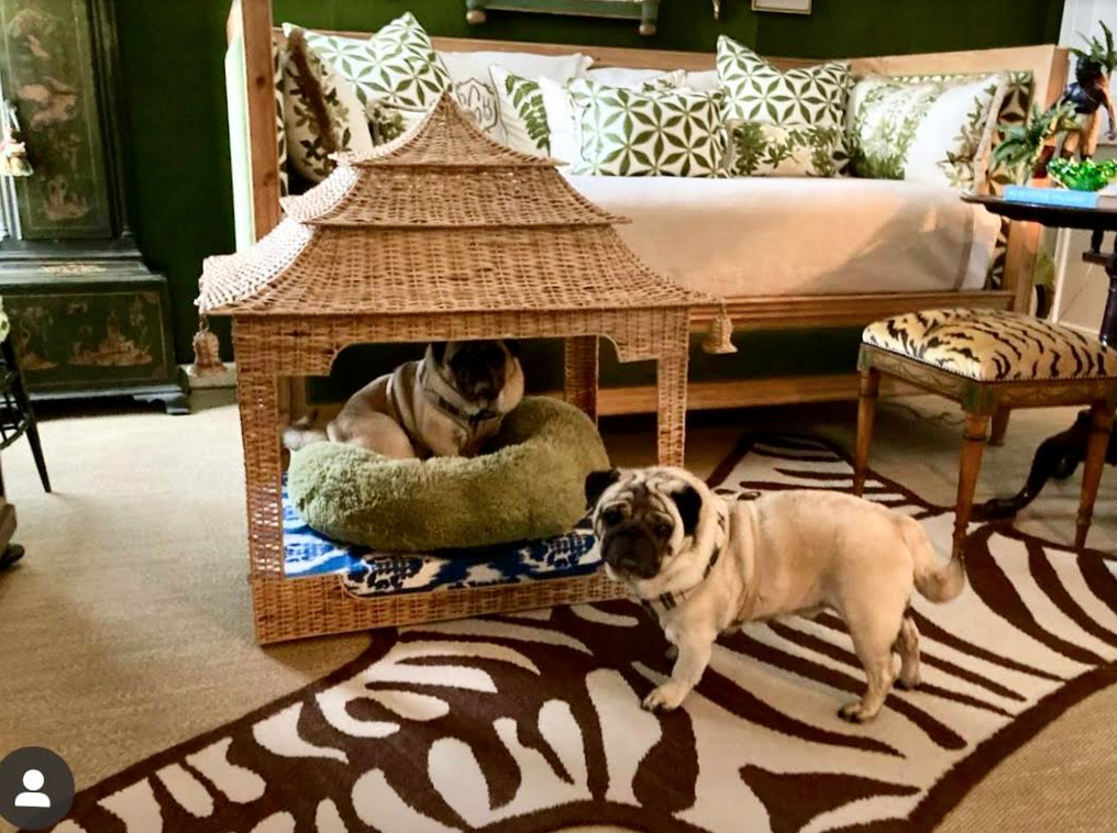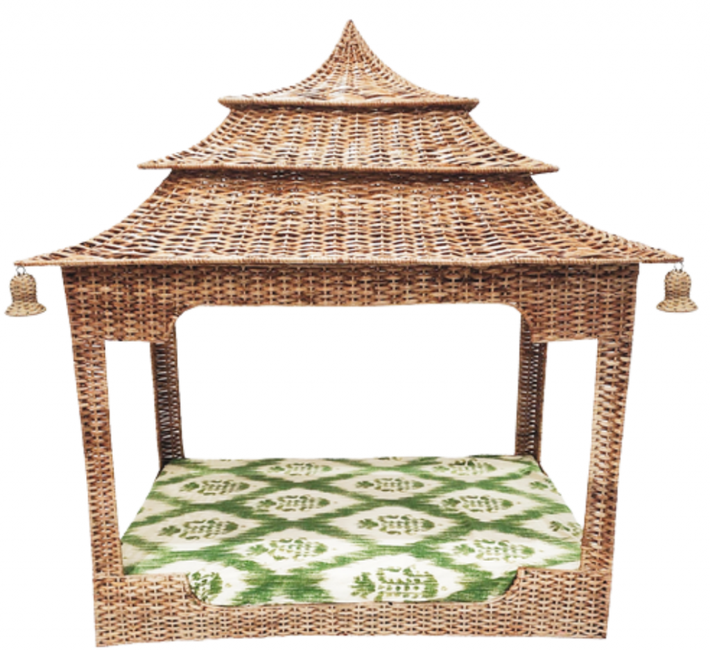 ITEM 9 We have limited numbers of our incredible pagoda dog beds. I mean, is this not the prettiest dog bed you have seen! Perfect for a smaller dog. This wicker masterpiece features a pretty ikat designed “mattress” in blue or green. Also has four wonderful wicker “bells” for an extra stylish touch.