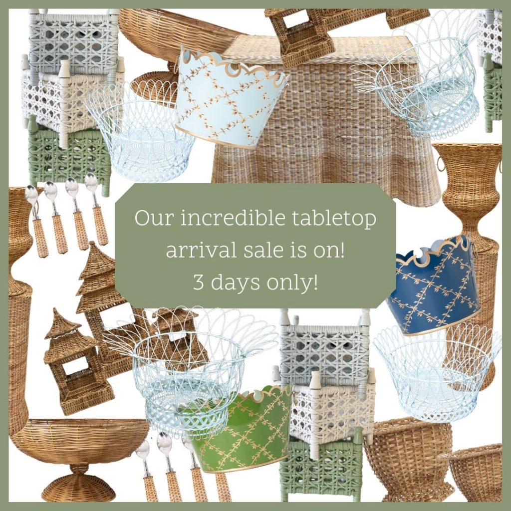 So many beautiful items–it’s hard to pick just one item. I do like the green metal compotes and the white wicker tabletop pieces. Both would be great on my antique wicker furniture pieces-laden screened porch.