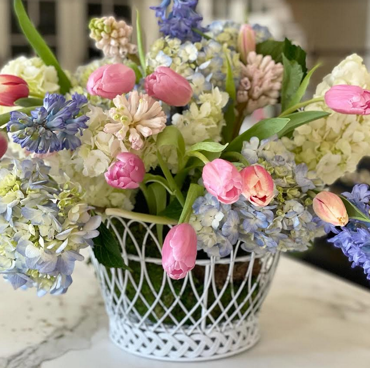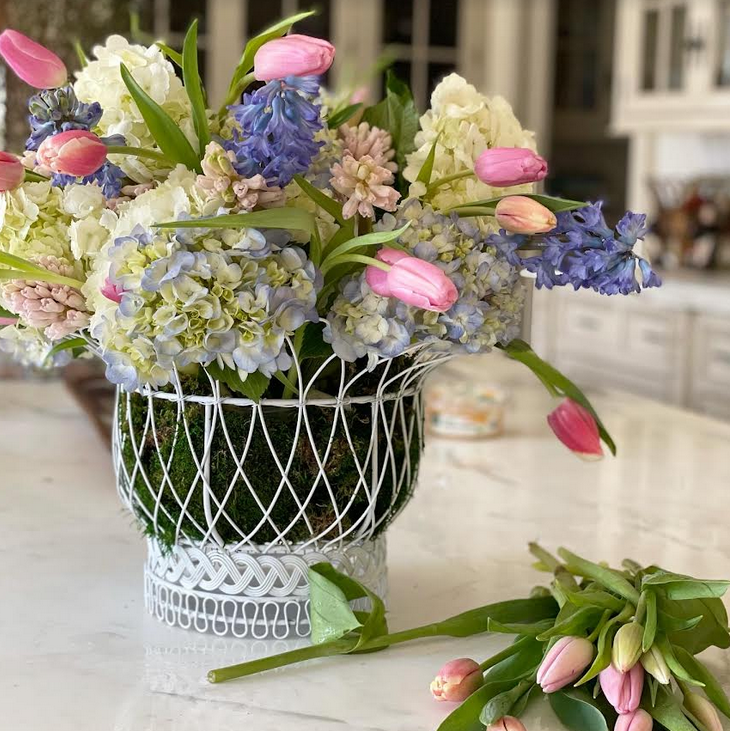 The French Wire Baskets are absolutely wonderful. Gorgeous with the hydrangea and tulip bouquet. Such a classic design, they would look good with any decor.