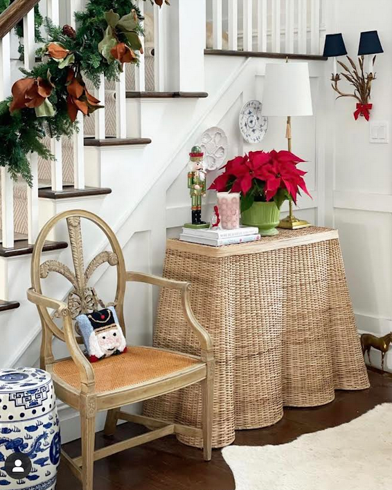 The skirted console is such an original piece, I love it! And all the wicker accessories, they are all beautiful