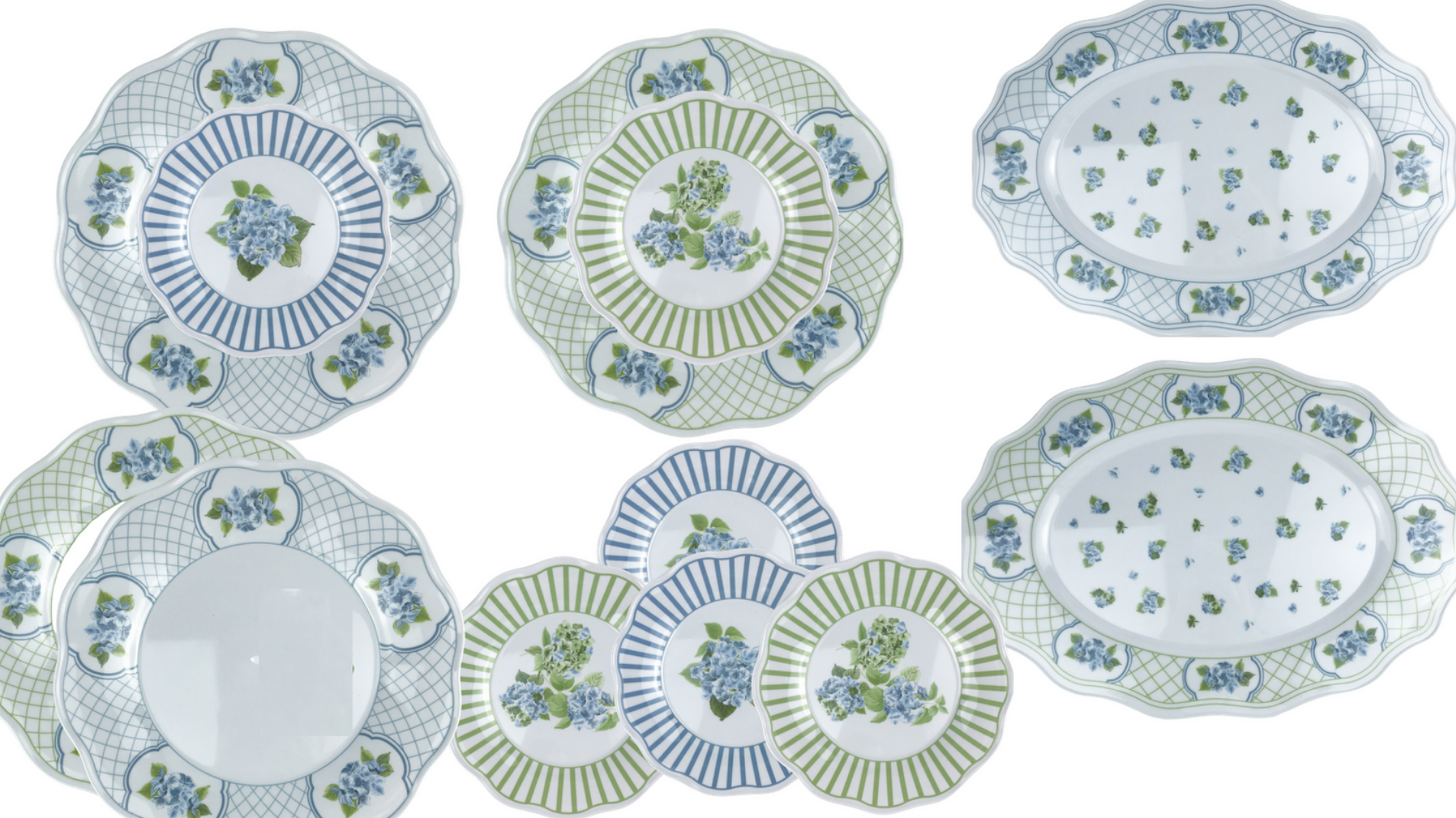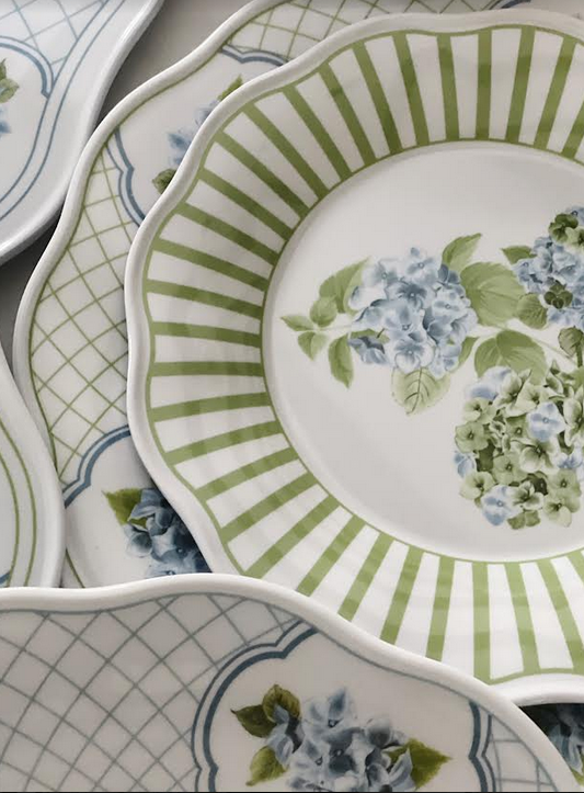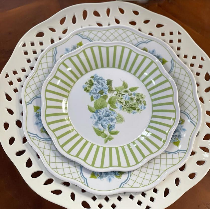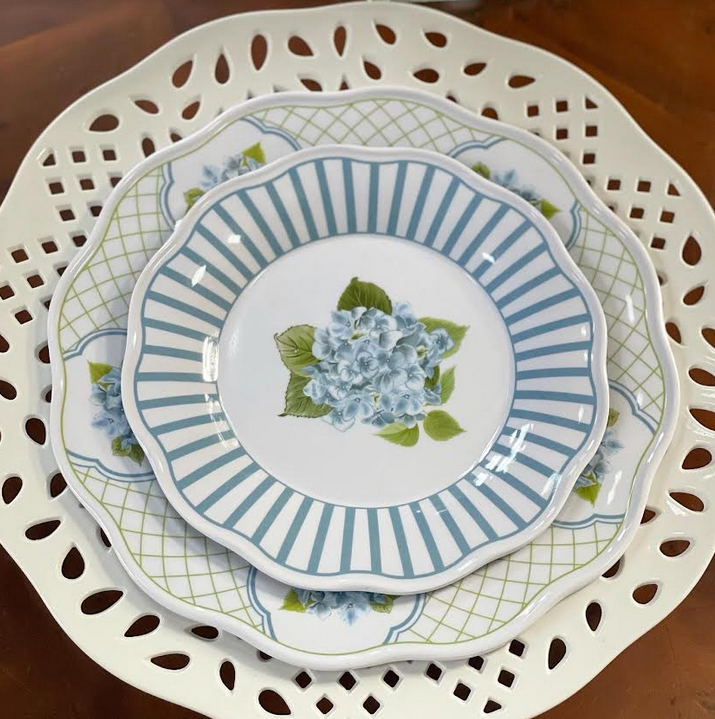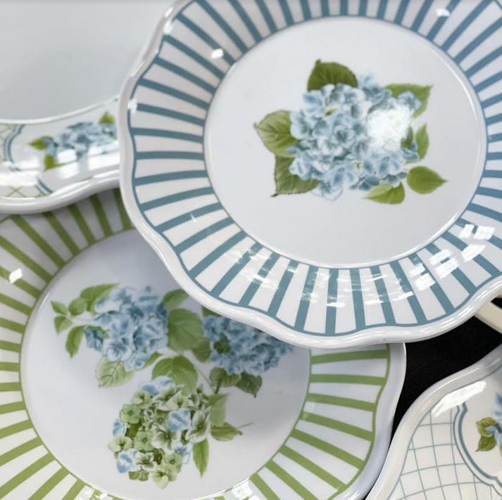 Hello! So excited to be officially introducing our newest melamine pattern, Hydrangea Garden. This is offered in two fabulous colors- blue and green (all interchangeable)! This was alive in my head for a long time and it was thrilling to see this come to life. I just love it and cannot wait to set a table with it!I know it will see plenty of use this spring and summer!