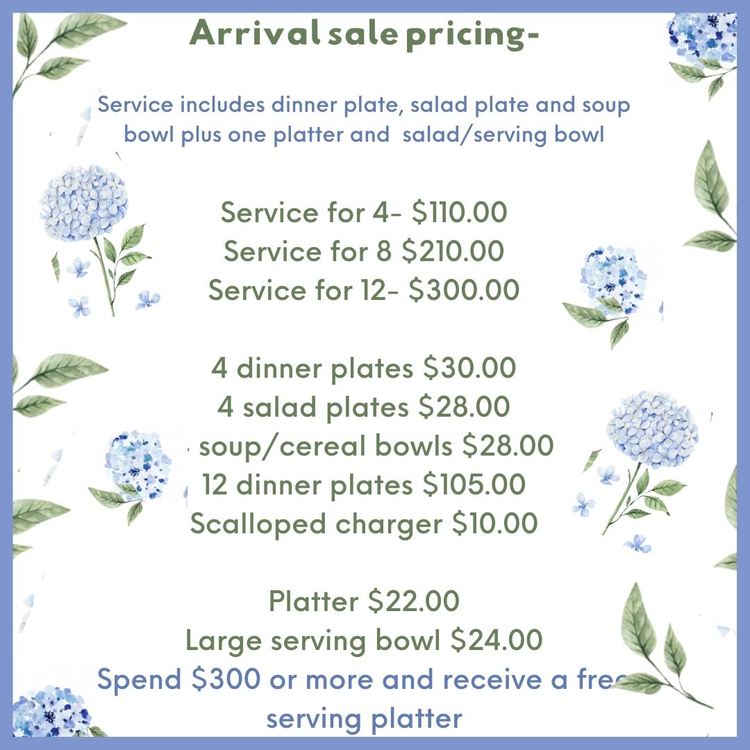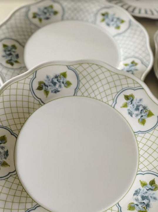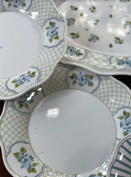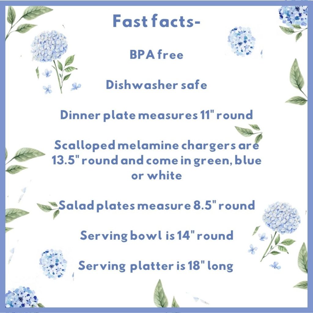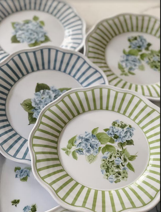 Hello! So excited to be officially introducing our newest melamine pattern, Hydrangea Garden. This is offered in two fabulous colors- blue and green (all interchangeable)! This was alive in my head for a long time and it was thrilling to see this come to life. I just love it and cannot wait to set a table with it!I know it will see plenty of use this spring and summer!
