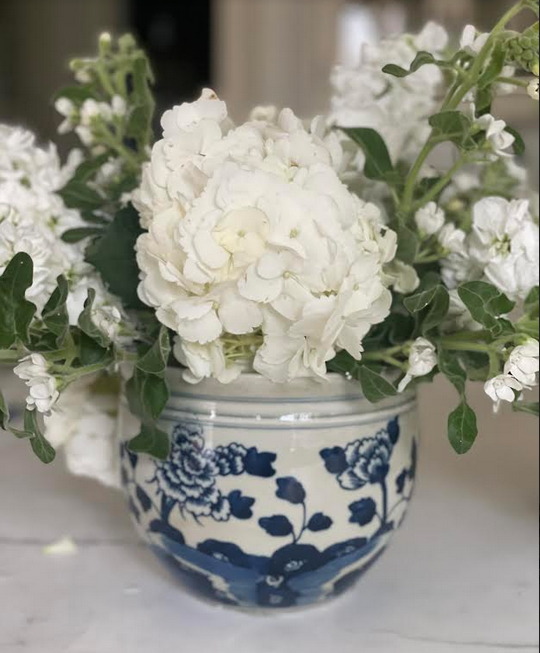 ITEM 14 By popular demand, our solid white fishbowl is coming back in stock. This is such an elegant piece and can work with any setting,  indoors or out. Perfect size for a large topiary or tree, boxwood ball or large flowering plant. Features the beautiful “lionhead” detailing with rings on either side.