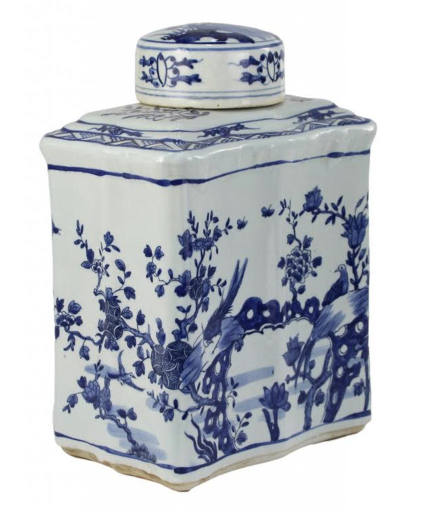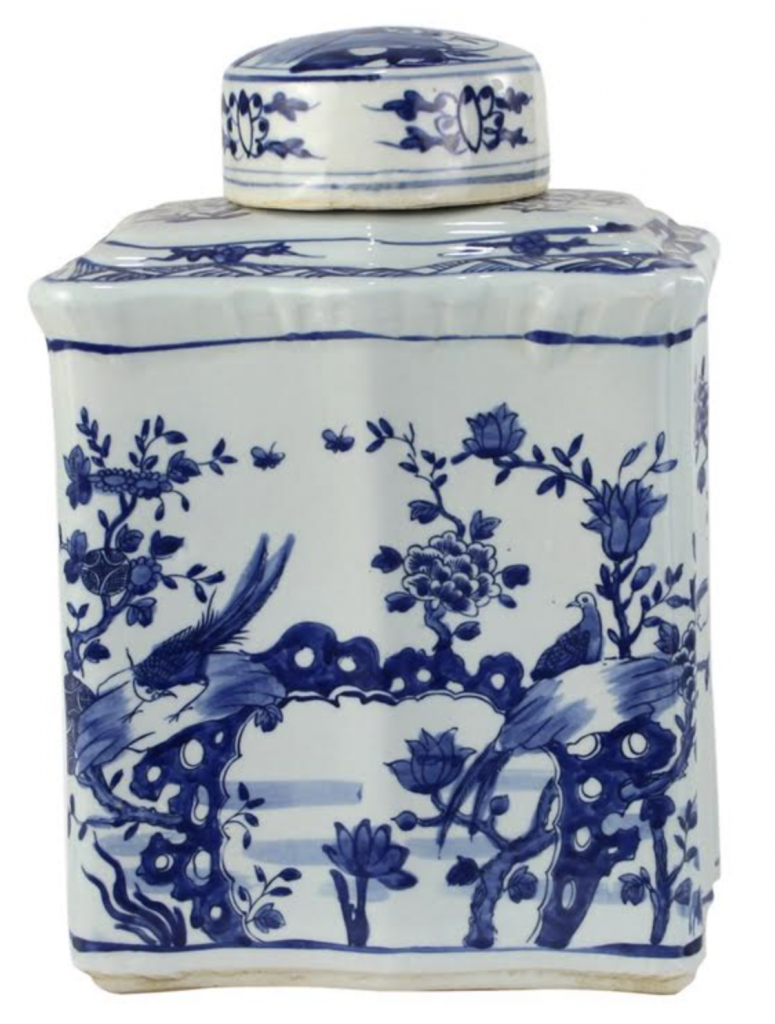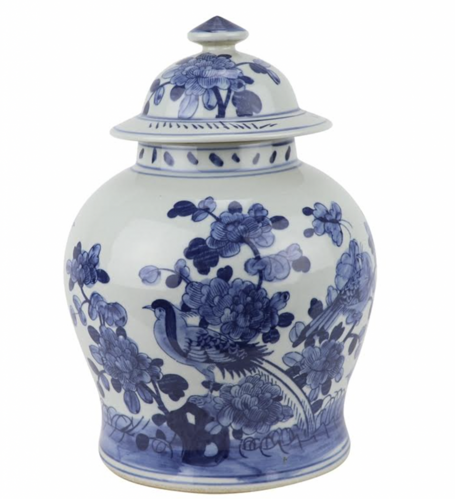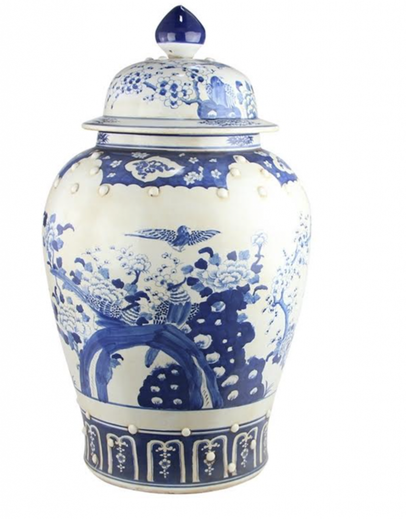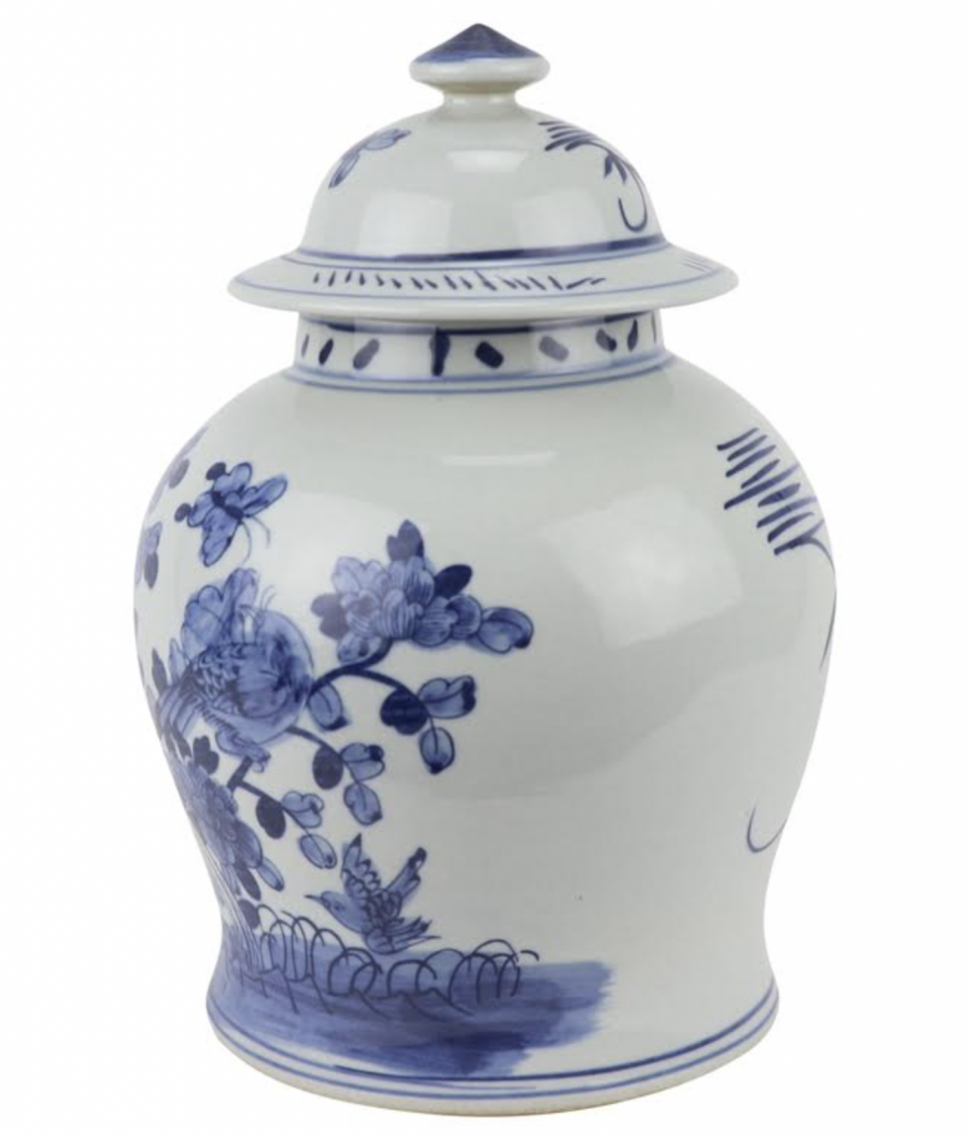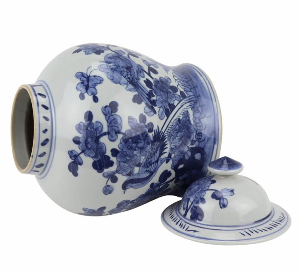 ITEM 3  NEW! And the green and white goodness continues with this beautiful new jar. How darling is this jar. I love the chunky shape, the same bird/floral scene in a classic ginger jar with a charming foo dog lid. Offered in both green/white and blue/white.