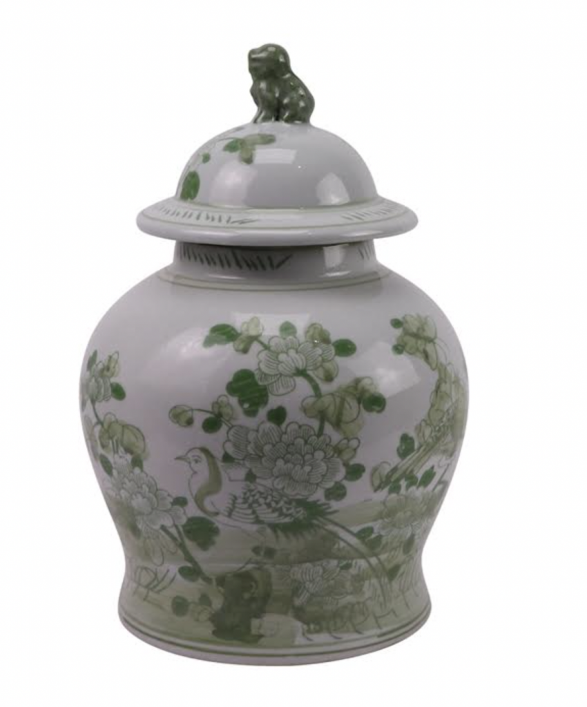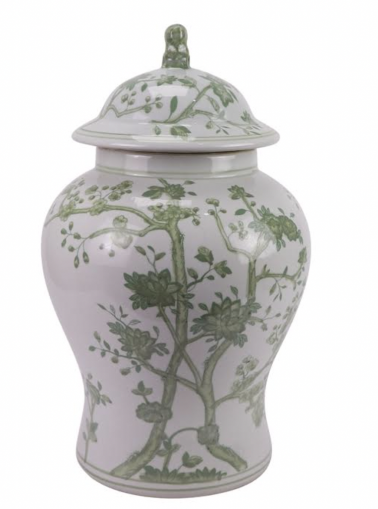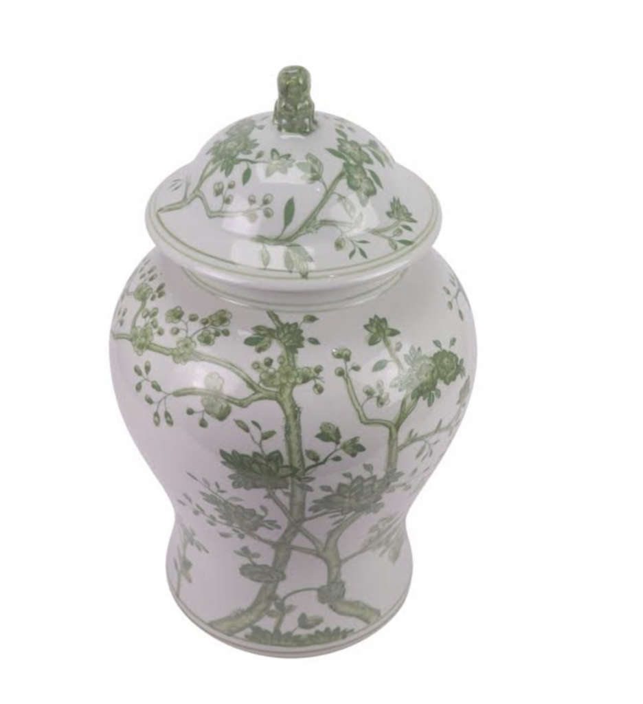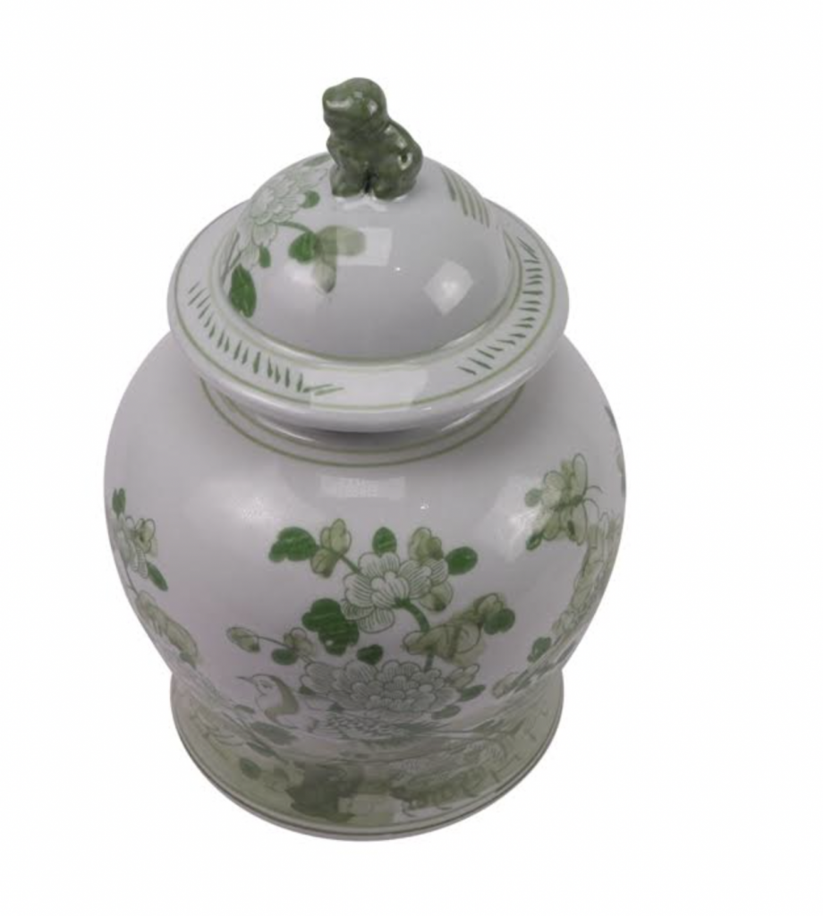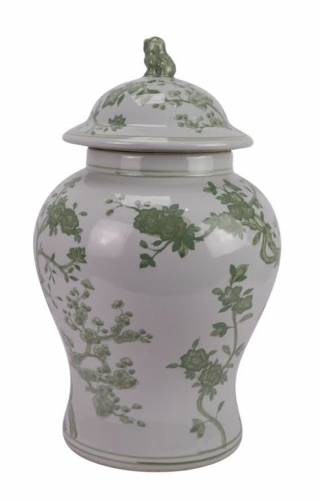 ITEM 1  NEW! Say hello to this fabulous green and white jar. You spoke and we listened and we are adding more green and white porcelain pieces (and wait till you see our spring/Easter collection). This gorgeous floral vine jar is the prefect size and features a darling foo dog lid. Perfect as a pair and imagine with white cherry blossoms!