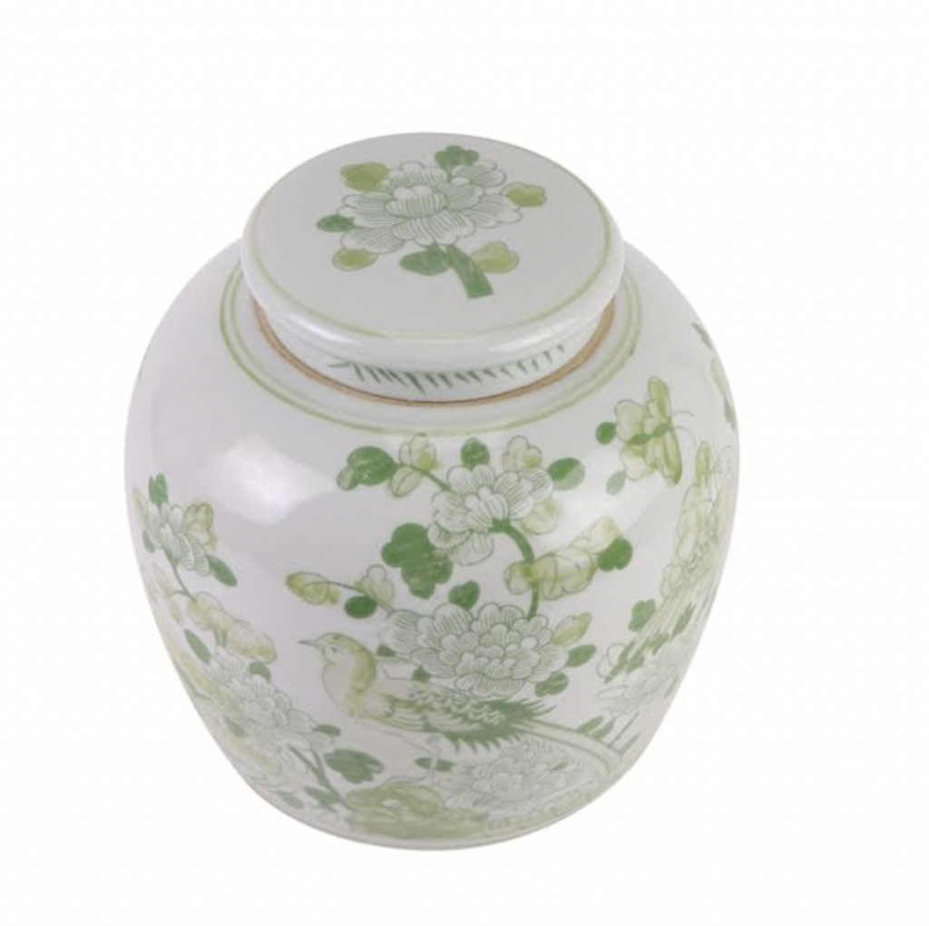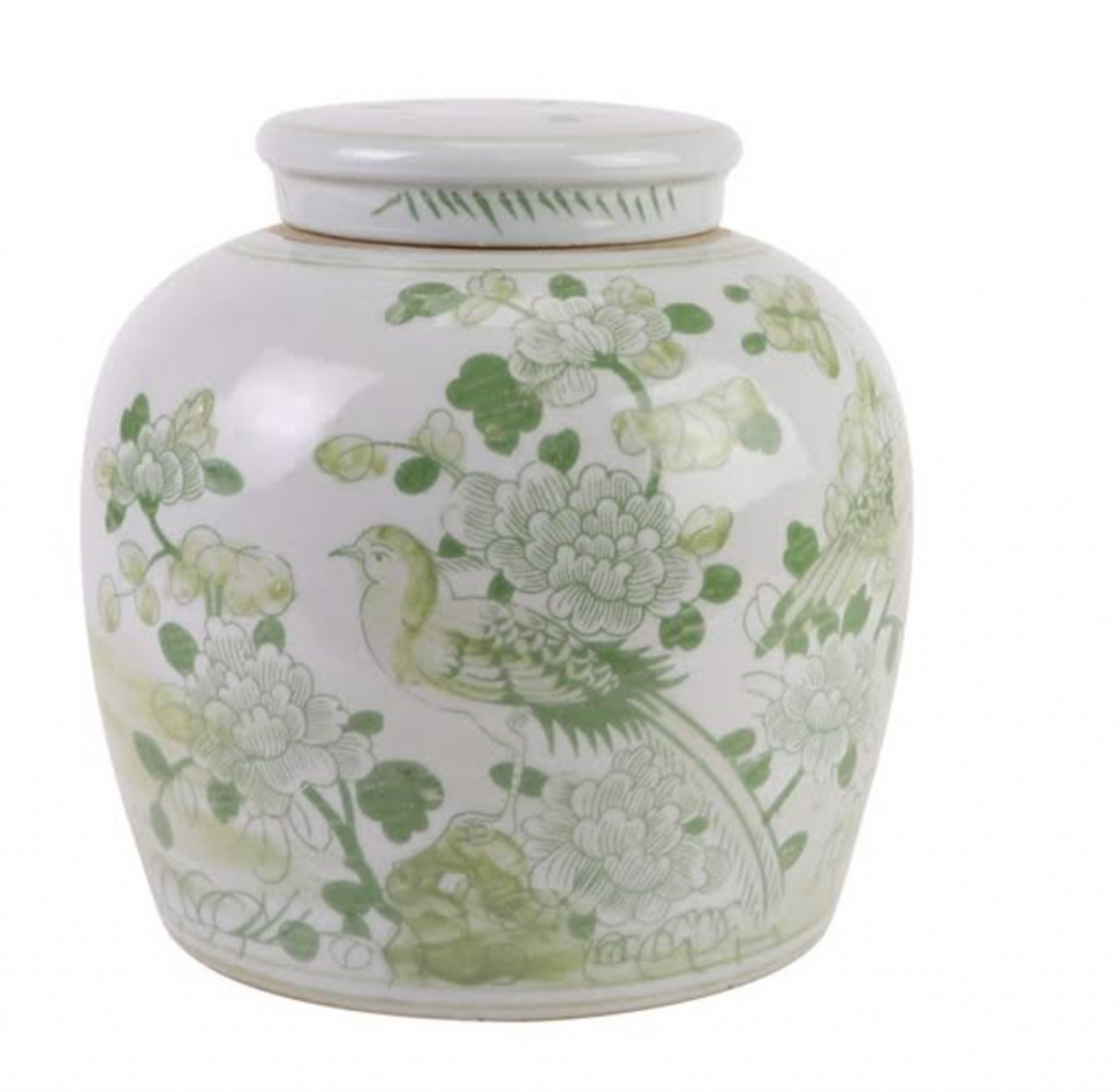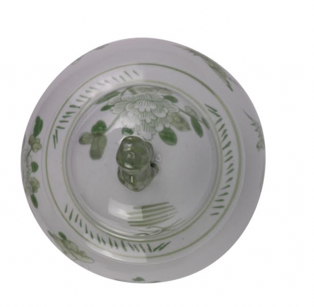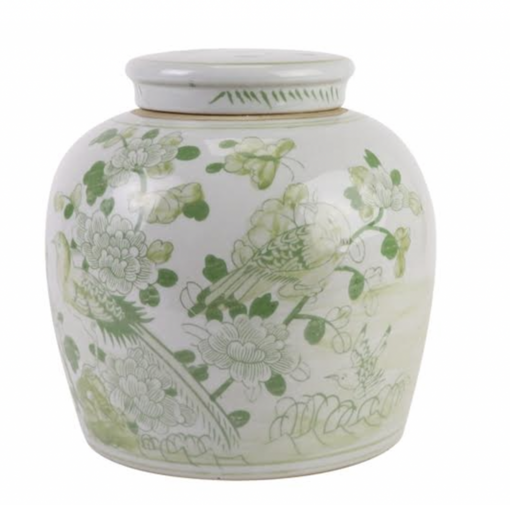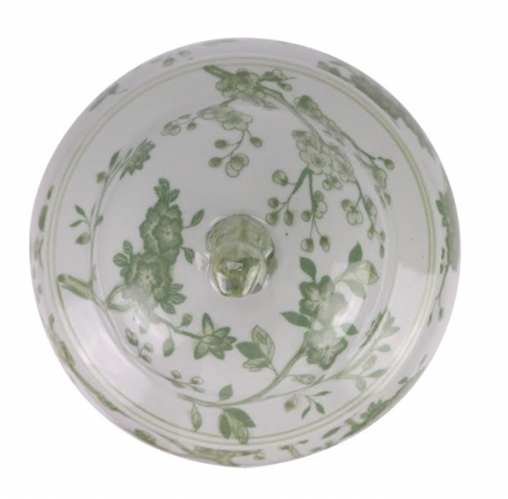 ITEM 1  NEW! Say hello to this fabulous green and white jar. You spoke and we listened and we are adding more green and white porcelain pieces (and wait till you see our spring/Easter collection). This gorgeous floral vine jar is the prefect size and features a darling foo dog lid. Perfect as a pair and imagine with white cherry blossoms!