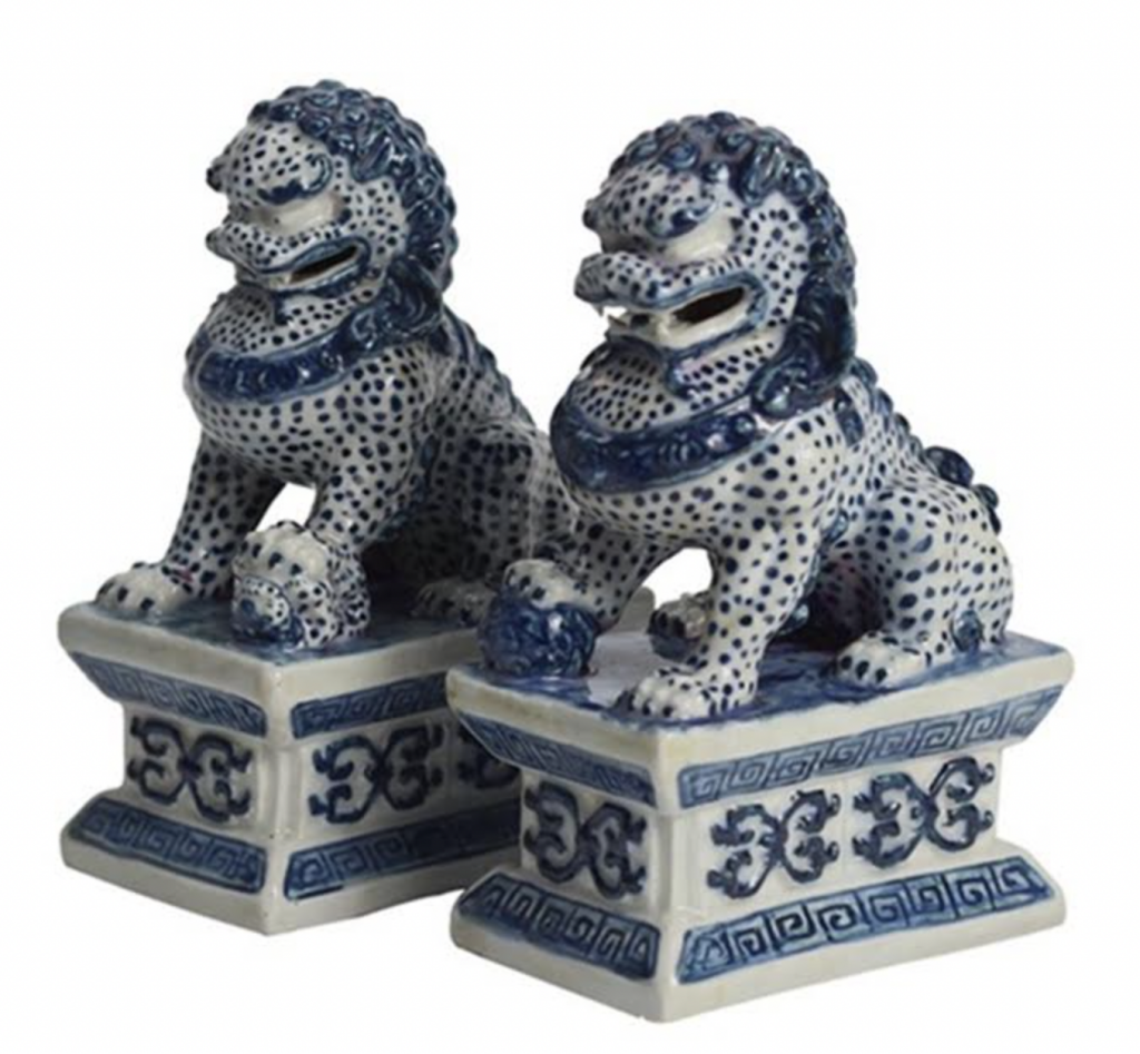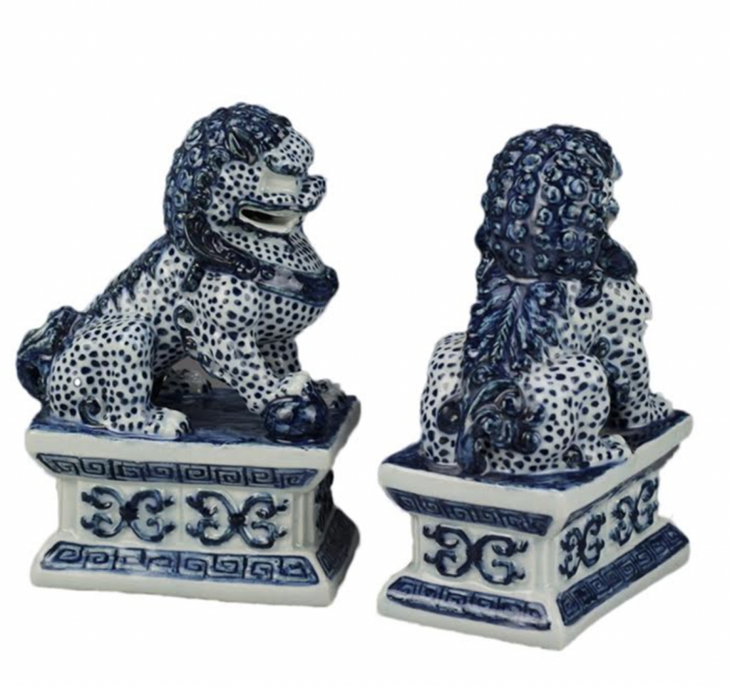 My favorite items are the finely detailed porcelain foo dogs. Albeit they are dogs, they remind me fondly of the world-renowned pair of marble lions (Patience & Fortitude) outside the NYC Public Library on 42nd Street & 5th Avenue, which are also magnificent. I see them on my fireplace mantle or as bookends in the secretary. 🙂