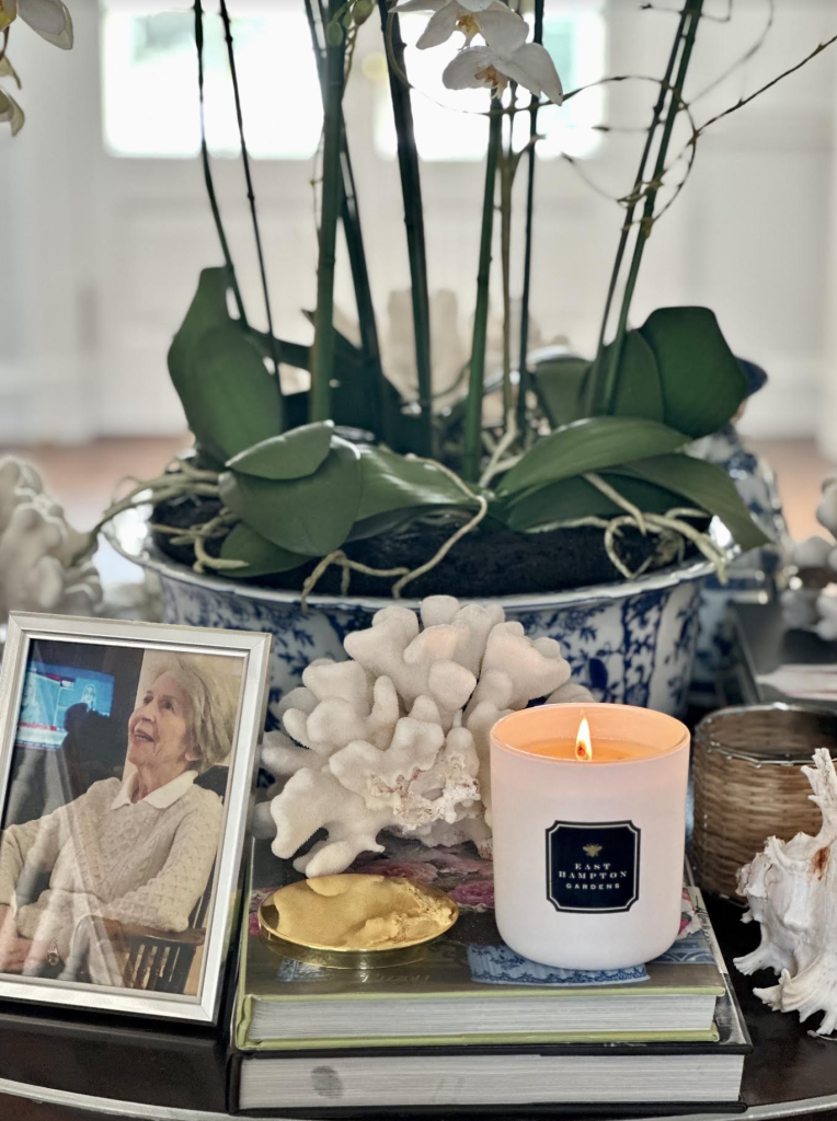 Burning one of my favorite candles from East Hampton Gardens, with a picture of my beautiful mom nearby