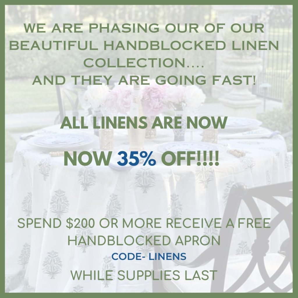 And our linens are 35% off as we are also phasing out of them as well. Still some buatiufl pieces remain.