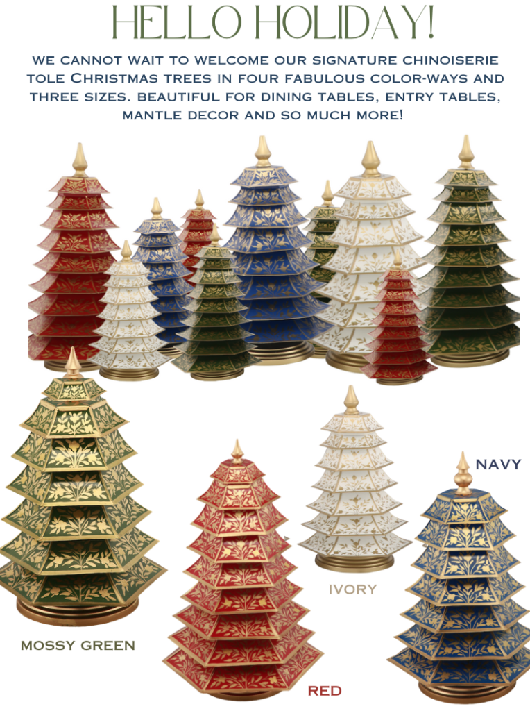 One of many favorite new items is the mossy green chinoiserie tole Christmas tree.