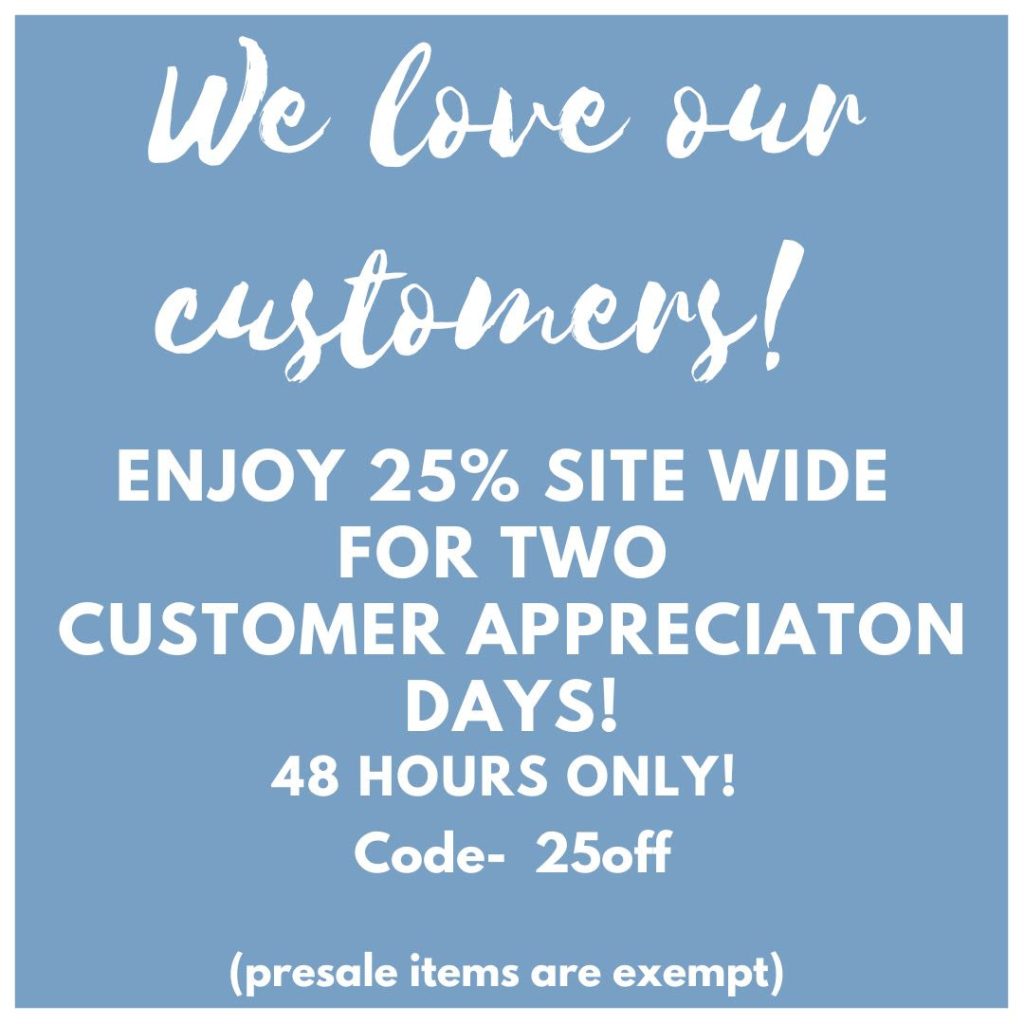 Second and last day of our “We love our customers” sale 25% off SITE WIDE (presages are exempt)