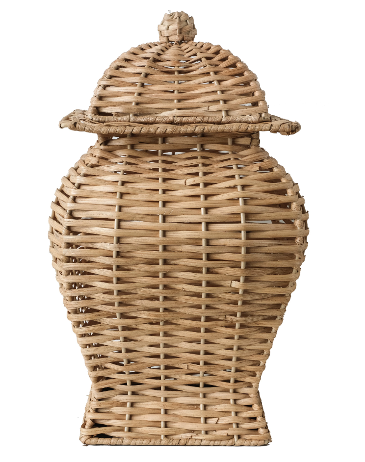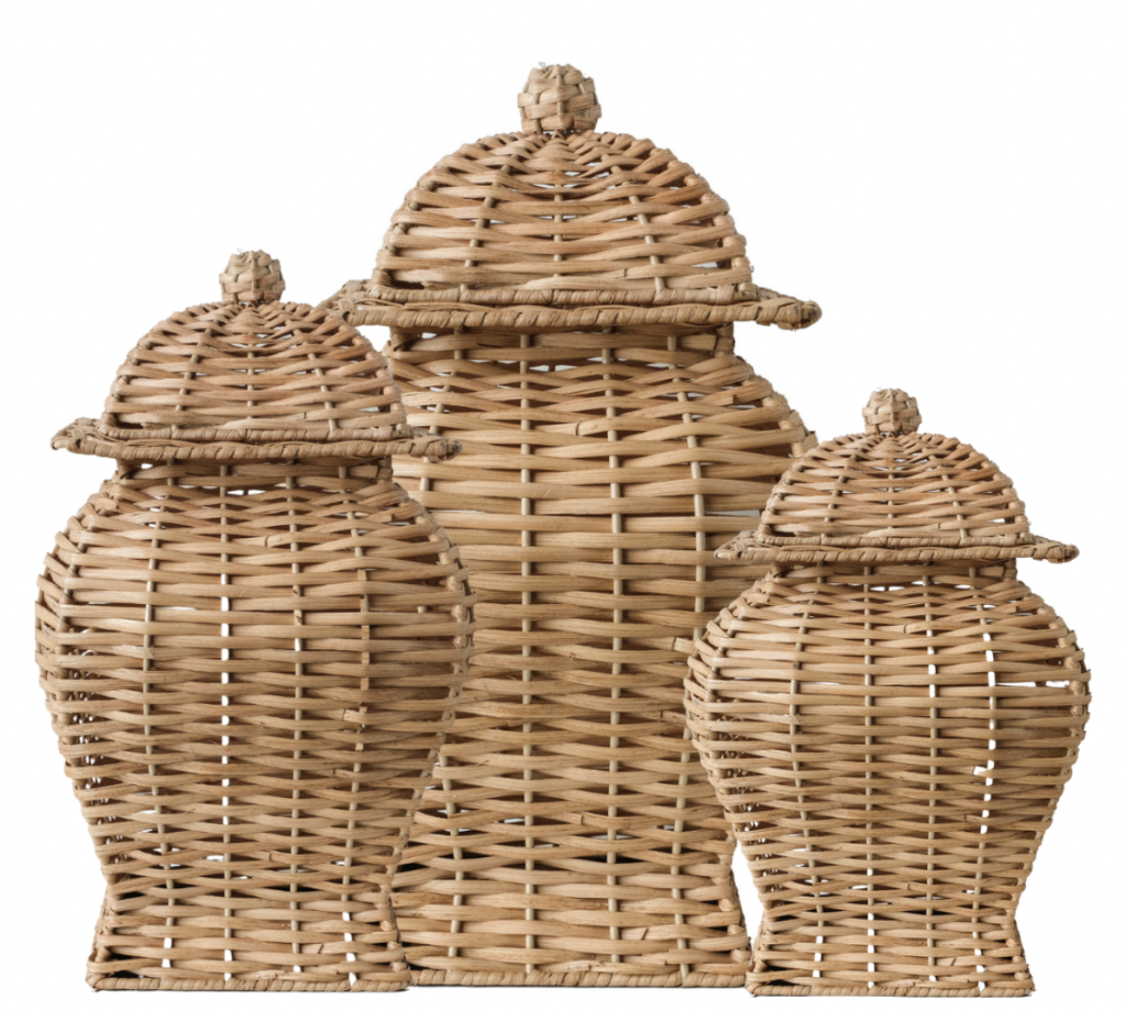 ITEM 8  Our best selling square wicker ginger jars are coming back! Love these, so decorative and good looking. Whether using all three or putting a pair on a console, mantle, etc….these make a statement. ARRIVING ON SEPT 24TH.