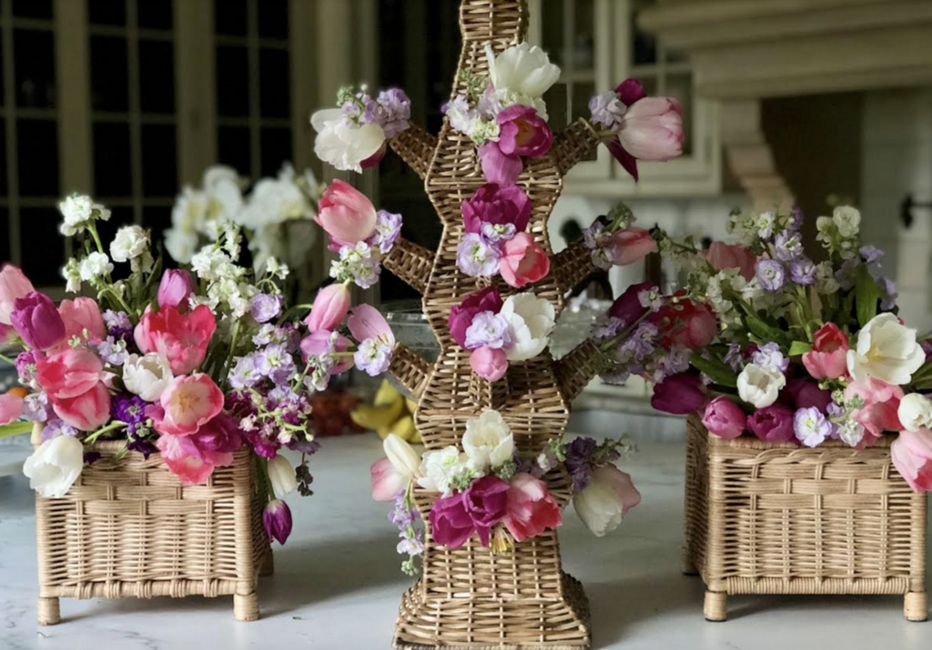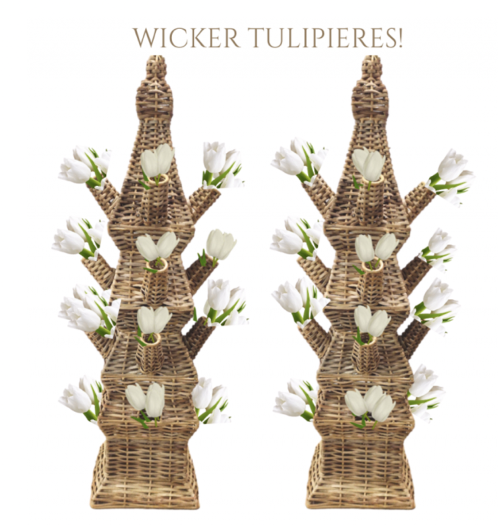 ITEM 9 Limited numbers of our beautiful wicker tulipieres, These are so unique and make such a beautiful statement (even without flowers) They are lined in sheet metal to hold water and these come in 4 pieces that stack.