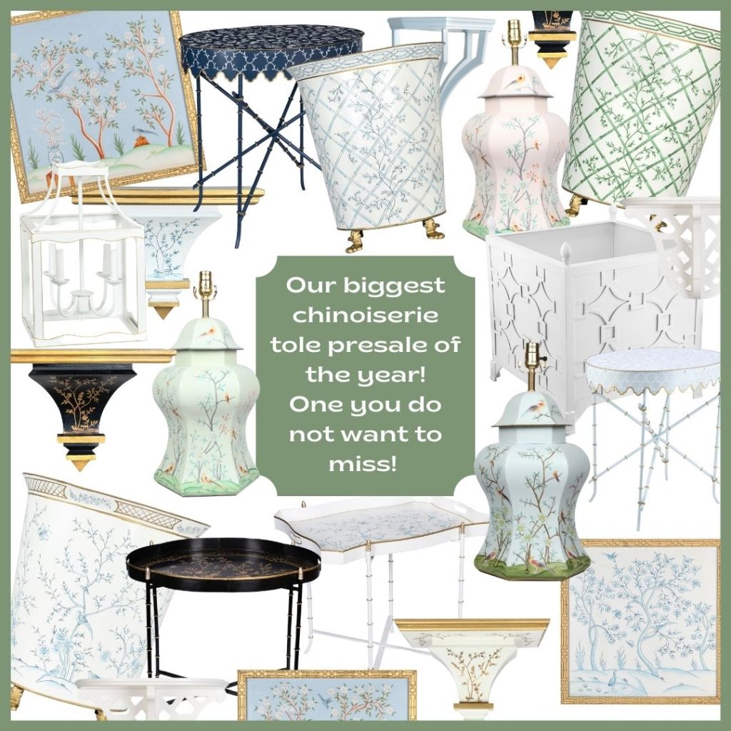 Hi friends, so we get several chinoiserie tole shipments throughout the year but we get our biggest one early fall. Andthis is that container. Brimming with so many beautiful, timeless pieces with a much welcome back to some of our all time best sellers. The beauty of purchasing during a presale is you are guaranteed to get what you want and know it will be in stock and score extra special pricing, so a win/win!